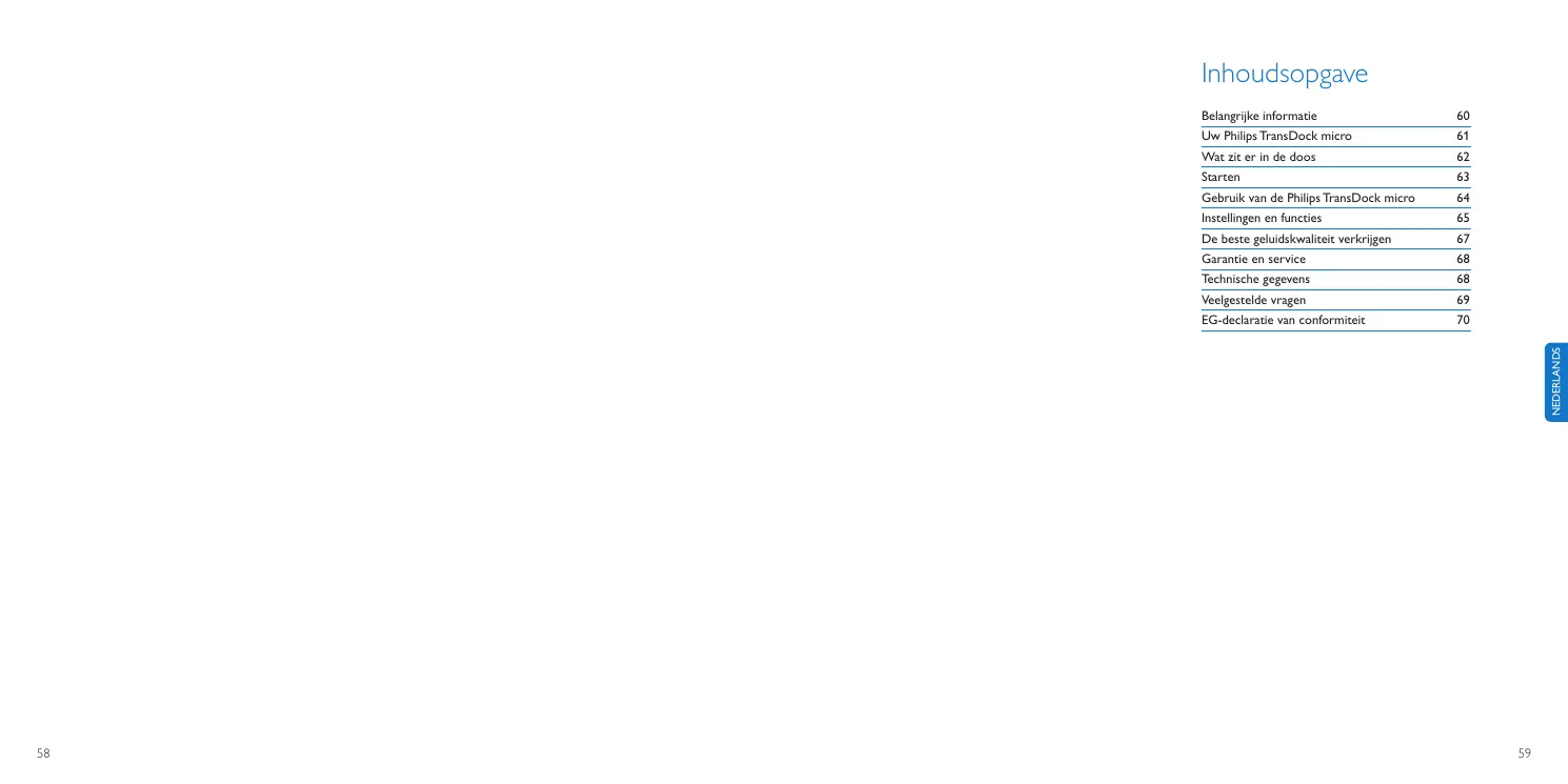Neem de tijd om deze handleiding te lezen voordat u uw Philips TransDock micro (DLA44000/10) gebruikt. Er staat belangrijke informatie over de bediening van uw Philips TransDock micro DLA44000/10. © 2008 Philips Consumer Lifestyle. Alle rechten voorbehouden. Gehele of gedeeltelijke reproductie zonder de schriftelijke toestemming van de copyright eigenaar is verboden. Handelsmerken zijn het eigendom van Koninklijke Philips N.V. of van hun respectieve eigenaars. iPod is een handelsmerk van Apple Inc., geregistreerd in de V.S. en andere landen. Philips Consumer Electronics, BG P&A, verklaart hierbij dat deze DLA44000/10 voldoet aan de noodzakelijke eisen en overige relevante voorzieningen van Richtlijn 1999/5/EC. D Opmerking: De beperkende drempel voor audio input is maximaal 180 mVSS Weggooien van uw oude product: Uw product is ontworpen en gefabriceerd met materialen en componenten van hoge kwaliteit die gerecycled en opnieuw gebruikt kunnen worden. WEEE-logo: Als dit doorgekruisde symbool voor vuilnisbak met wielen toegevoegd is aan een product, betekent dit dat het product onder de Europese richtlijn 2002/96/EC valt. Stel uzelf op de hoogte van het plaatselijke systeem voor het gescheiden ophalen van elektrische en elektronische producten. B Waarschuwingen