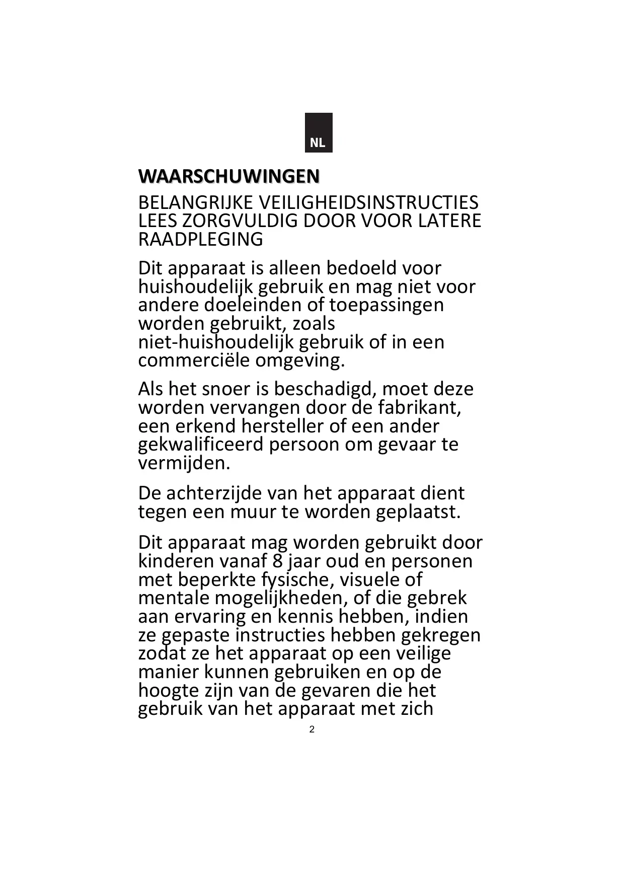 RAADPLEGING Dit apparaat is alleen bedoeld voor huishoudelijk gebruik en mag niet voor andere doeleinden of toepassingen worden gebruikt, zoals niet-huishoudelijk gebruik of in een commerciële omgeving. Als het snoer is beschadigd, moet deze worden vervangen door de fabrikant, een erkend hersteller of een ander gekwalificeerd persoon om gevaar te vermijden. De achterzijde van het apparaat dient tegen een muur te worden geplaatst. Dit apparaat mag worden gebruikt door kinderen vanaf 8 jaar oud en personen met beperkte fysische, visuele of mentale mogelijkheden, of die gebrek aan ervaring en kennis hebben, indien ze gepaste instructies hebben gekregen zodat ze het apparaat op een veilige manier kunnen gebruiken en op de hoogte zijn van de gevaren die het gebruik van het apparaat met zich