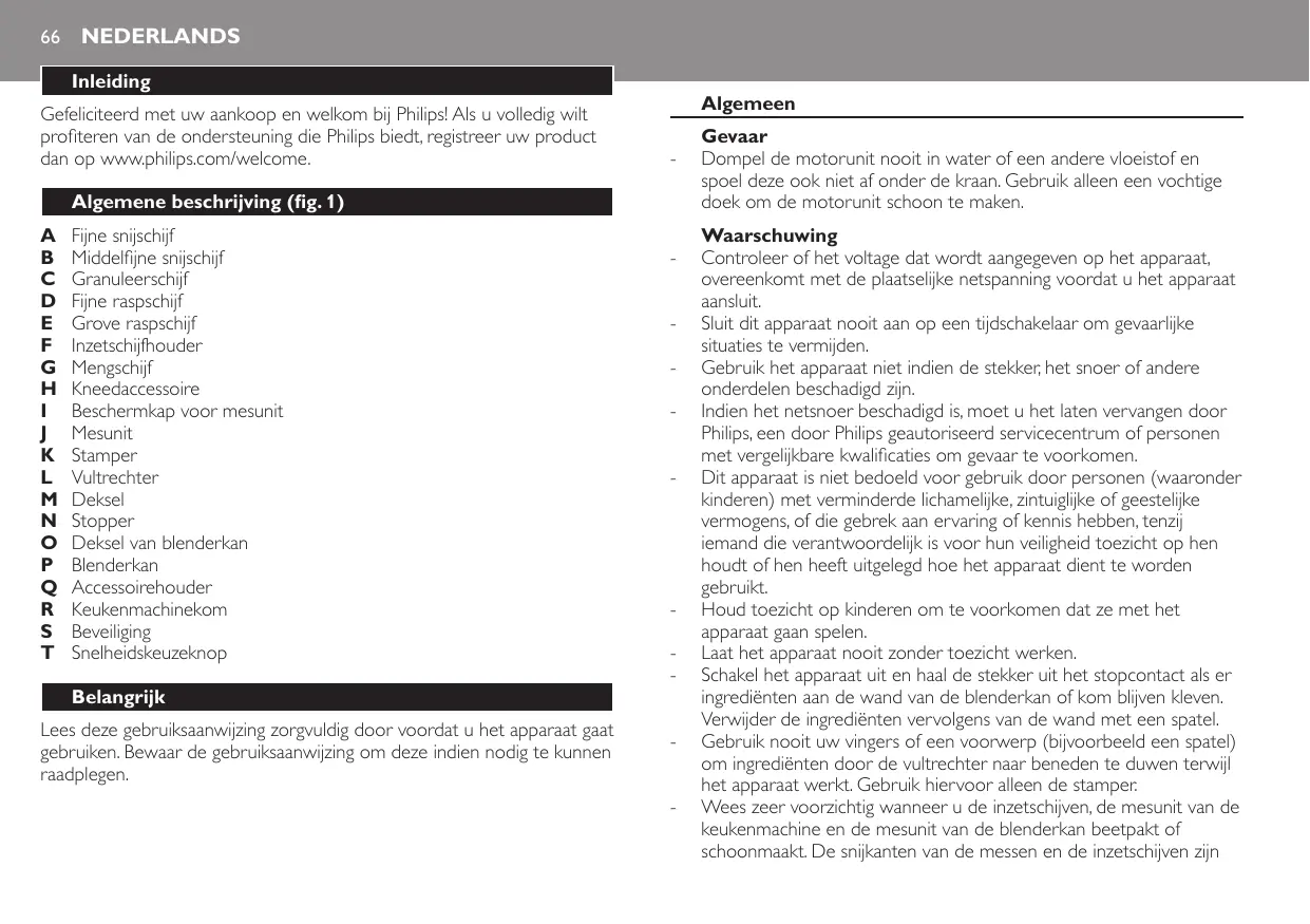 Algemeen Gevaar -- Dompel de motorunit nooit in water of een andere vloeistof en spoel deze ook niet af onder de kraan. Gebruik alleen een vochtige doek om de motorunit schoon te maken. Waarschuwing -- Controleer of het voltage dat wordt aangegeven op het apparaat, overeenkomt met de plaatselijke netspanning voordat u het apparaat aansluit. -- Sluit dit apparaat nooit aan op een tijdschakelaar om gevaarlijke situaties te vermijden. -- Gebruik het apparaat niet indien de stekker, het snoer of andere onderdelen beschadigd zijn. -- Indien het netsnoer beschadigd is, moet u het laten vervangen door Philips, een door Philips geautoriseerd servicecentrum of personen met vergelijkbare kwalificaties om gevaar te voorkomen. -- Dit apparaat is niet bedoeld voor gebruik door personen (waaronder kinderen) met verminderde lichamelijke, zintuiglijke of geestelijke vermogens, of die gebrek aan ervaring of kennis hebben, tenzij iemand die verantwoordelijk is voor hun veiligheid toezicht op hen houdt of hen heeft uitgelegd hoe het apparaat dient te worden gebruikt. -- Houd toezicht op kinderen om te voorkomen dat ze met het apparaat gaan spelen. -- Laat het apparaat nooit zonder toezicht werken. -- Schakel het apparaat uit en haal de stekker uit het stopcontact als er ingrediënten aan de wand van de blenderkan of kom blijven kleven. Verwijder de ingrediënten vervolgens van de wand met een spatel. -- Gebruik nooit uw vingers of een voorwerp (bijvoorbeeld een spatel) om ingrediënten door de vultrechter naar beneden te duwen terwijl het apparaat werkt. Gebruik hiervoor alleen de stamper. -- Wees zeer voorzichtig wanneer u de inzetschijven, de mesunit van de keukenmachine en de mesunit van de blenderkan beetpakt of schoonmaakt. De snijkanten van de messen en de inzetschijven zijn