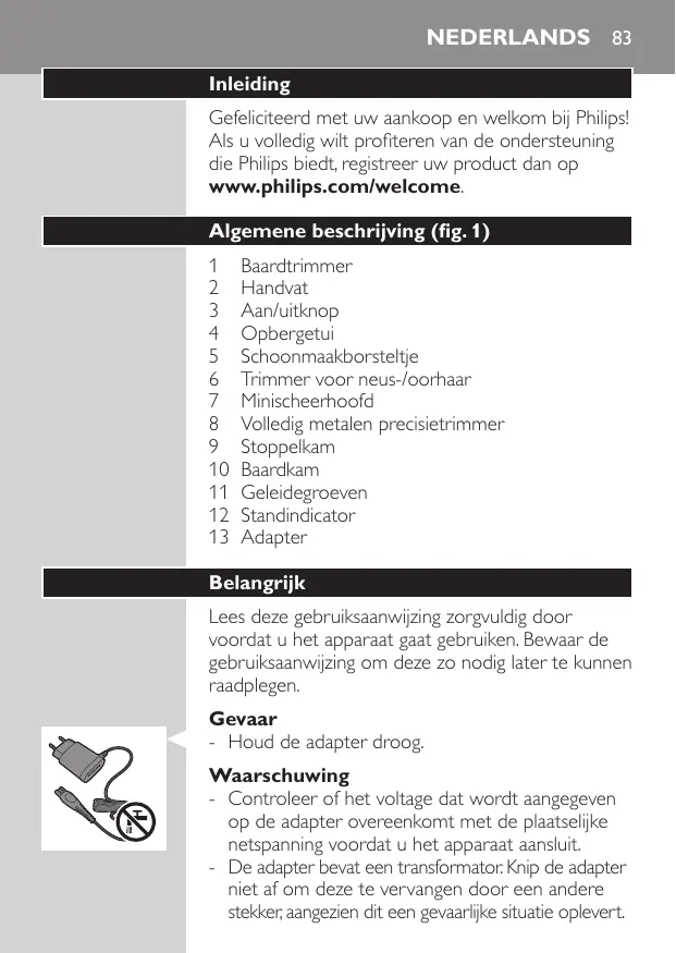 Baardtrimmer Handvat Aan/uitknop Opbergetui Schoonmaakborsteltje Trimmer voor neus-/oorhaar Minischeerhoofd Volledig metalen precisietrimmer Stoppelkam Baardkam Geleidegroeven Standindicator Adapter Belangrijk Lees deze gebruiksaanwijzing zorgvuldig door voordat u het apparaat gaat gebruiken. Bewaar de gebruiksaanwijzing om deze zo nodig later te kunnen raadplegen. Gevaar -- Houd de adapter droog. Waarschuwing -- Controleer of het voltage dat wordt aangegeven op de adapter overeenkomt met de plaatselijke netspanning voordat u het apparaat aansluit. -- De adapter bevat een transformator. Knip de adapter niet af om deze te vervangen door een andere stekker, aangezien dit een gevaarlijke situatie oplevert.