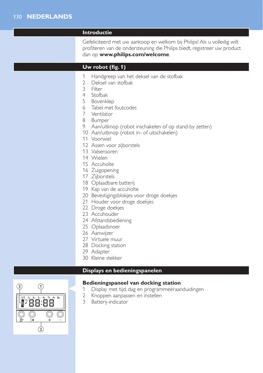 Handgreep van het deksel van de stofbak Deksel van stofbak Filter Stofbak Bovenklep Tabel met foutcodes Ventilator Bumper Aan/uitknop (robot inschakelen of op stand-by zetten) Aan/uitknop (robot in- of uitschakelen) Voorwiel Assen voor zijborstels Valsensoren Wielen Accuholte Zuigopening Zijborstels Oplaadbare batterij Kap van de accuholte Bevestigingsblokjes voor droge doekjes Houder voor droge doekjes Droge doekjes Accuhouder Afstandsbediening Oplaadsnoer Aanwijzer Virtuele muur Docking station Adapter Kleine stekker Displays en bedieningspanelen Bedieningspaneel van docking station 1 Display met tijd, dag en programmeeraanduidingen 2 Knoppen aanpassen en instellen 3 Batterij-indicator NEDERLANDS 131 Afstandsbediening