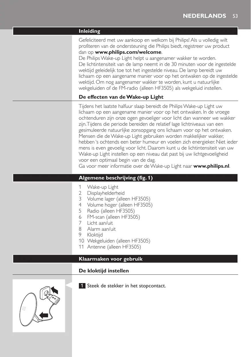 Inleiding Gefeliciteerd met uw aankoop en welkom bij Philips! Als u volledig wilt profiteren van de ondersteuning die Philips biedt, registreer uw product dan op www.philips.com/welcome. De Philips Wake-up Light helpt u aangenamer wakker te worden. De lichtintensiteit van de lamp neemt in de 30 minuten voor de ingestelde wektijd geleidelijk toe tot het ingestelde niveau. De lamp bereidt uw lichaam op een aangename manier voor op het ontwaken op de ingestelde wektijd. Om nog aangenamer wakker te worden, kunt u natuurlijke wekgeluiden of de FM-radio (alleen HF3505) als wekgeluid instellen. De effecten van de Wake-up Light Tijdens het laatste halfuur slaap bereidt de Philips Wake-up Light uw lichaam op een aangename manier voor op het ontwaken. In de vroege ochtenduren zijn onze ogen gevoeliger voor licht dan wanneer we wakker zijn. Tijdens die periode bereiden de relatief lage lichtniveaus van een gesimuleerde natuurlijke zonsopgang ons lichaam voor op het ontwaken. Mensen die de Wake-up Light gebruiken worden makkelijker wakker, hebben ‘s ochtends een beter humeur en voelen zich energieker. Niet ieder mens is even gevoelig voor licht. Daarom kunt u de lichtintensiteit van uw Wake-up Light instellen op een niveau dat past bij uw lichtgevoeligheid voor een optimaal begin van de dag. Ga voor meer informatie over de Wake-up Light naar www.philips.nl. Algemene beschrijving (fig. 1)