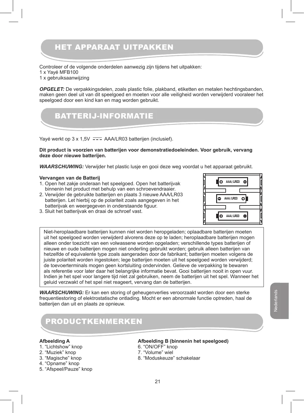 Niet-heroplaadbare batterijen können nicht worden heropgeladen; oplaadbare batterijen要去en uit het spellegood worden verwijderd alvorens deze op te laden; heroplaadbare batterijen月至en alleen onder toezicht van een volwassene worden opgeladen; verschillende types batterijen of neue en oude batterijen mogen Niet onderling gebruikt worden; gebruik alleen batterijen van hetzelfde of equivalente type Zoals aangeraden door de fabrikant; batterijen要去en volgens de juiste polariteit worden ingestoken; lege batterijen要去en uit het spellegood worden verwijderd; de toevoerterminals mogen geen kortsuiingondervinden. Gelieve de verpakking te bewaren als referentie voor lateraar het belangrijke informatie bevat. Gooi batterijen nooit in open vuur. Indien je het spel voor langere tijd Niet za gebruiken, neem de batterijen uit het spel. Wanner het geluid verzwakt of het spel Niet reageert, verrang dan de batterijen.