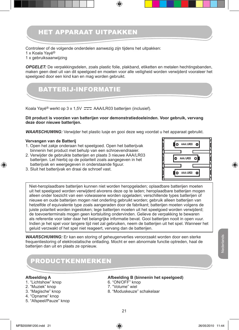 Niet-heroplaadbare batterijen können nicht worden heropgeladen; oplaadbare batterijen要去 uit het spellegood worden verwijderd alvorens deze op te laden; heroplaadbare batterijen月至en alleen onder toezicht van een volwassene worden opgeladen; verschillende types batterijen of neue en oude batterijen mogen Niet onderling gebruikt worden; gebruik alleen batterijen van hetzelfde of equivalente type zoals aangeraden door de fabrikant; batterijen要去 volgens de juiste polariteit worden ingestoken; lege batterijen要去 uit het spellegood worden verwijderd; de toevoerterminals mogen geen kortsuiing undervinden. Gelieve de verpakking te bewaren als referentie voor lateraar het belangrijke informatie bevat. Gooi batterijen nooit in open vuur. Indien je het spel voor langere tijd Niet za gefruiken, neem de batterijen uit het spel. Wanner het geluid verzwakt of het spel Niet reageert, verrang dan de batterijen.