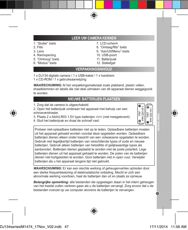 1. Assurez-vous que l’appareil photo est éteint. 2. Utilisez un tournevis pour ouvrir le couvercle du compartiment des piles situé sous l’appareil. 3. Insérez 2 piles de type AAA/LR03 de 1.5V (non fournies). 4. Refermez le compartiment à piles et resserrez la vis. Ne pas recharger les piles non rechargeables. Retirer les accumulateurs du produit avant de les recharger. Ne charger les accumulateurs que sous la surveillance d’un adulte. Ne pas mélanger différents types de piles ou accumulateurs, ou des piles et accumulateurs neufs et usagés. Les piles et accumulateurs doivent être mis en place en respectant la polarité. Les piles et accumulateurs usagés doivent être enlevés du produit. Les bornes d’une pile ou d’un accumulateur ne doivent pas être mises en court-circuit. Ne pas jeter les piles au feu. Retirer les piles en cas de non utilisation prolongée. ATTENTION : D’importantes interférences électromagnétiques ou décharges électrostatiques peuvent provoquer un dysfonctionnement ou une perte de données. Si l’appareil ne fonctionne pas correctement, enlevez puis remettez les piles. Remarque importante : Tous les fichiers enregistrés dans la mémoire interne de l’appareil s’effacent lorsque les piles sont remplacées. Assurez-vous de transférer les fichiers sur votre ordinateur avant cette manipulation.