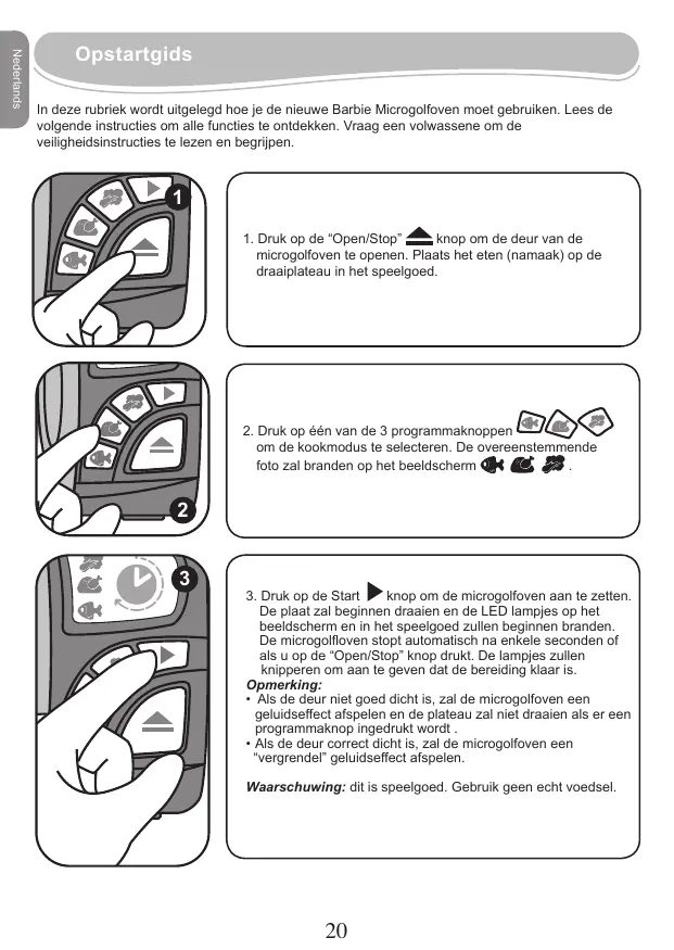 Deutsch Flege und Wartung / Garantie Nederlands Opstartgids In deze rubriek wordt uitgelegd hoe je de nieuwe Barbie Microgolfoven moet gebruiken. Lees de volgende instructies om alle functies te ontdekken. Vraag een volwassene om de veiligheidsinstructies te lezen en begrijpen.