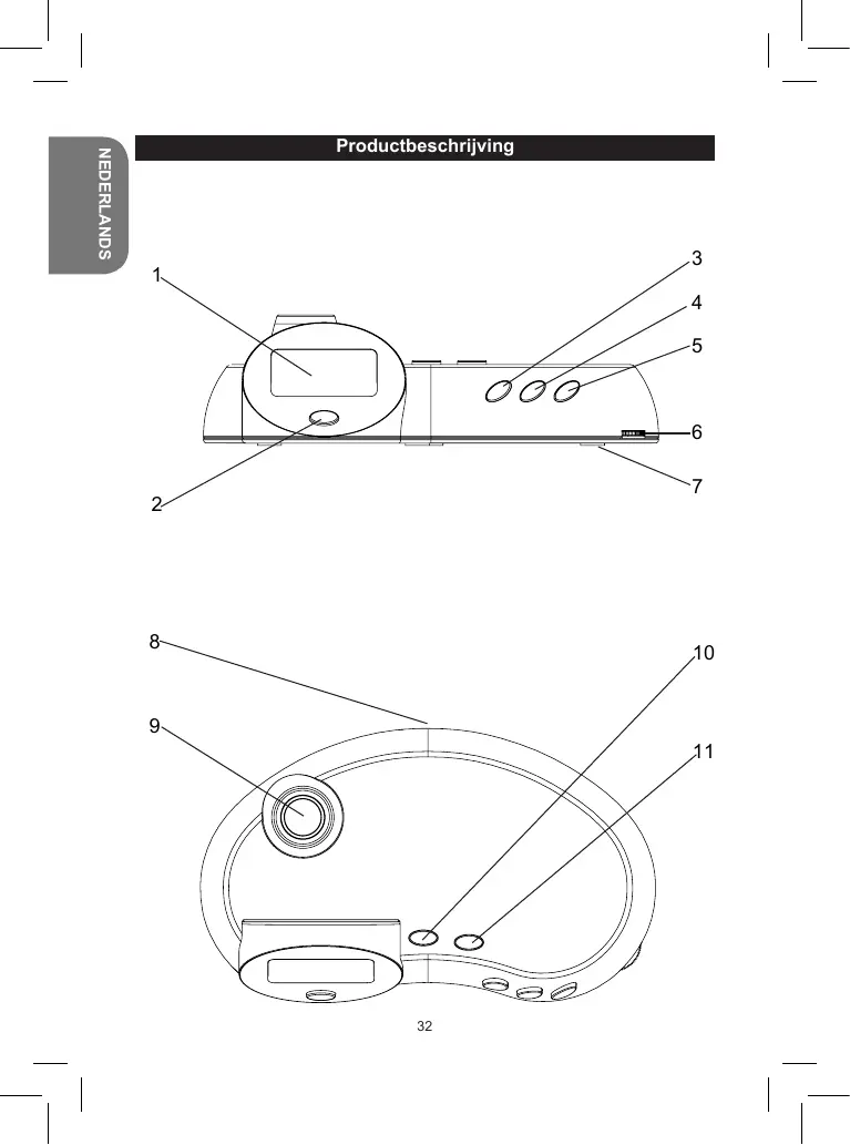 7. Compartiment à piles (sous l’appareil) 8. Antenne radio 9. Projecteur 10. SCAN: Rechercher des stations radio. 11. RESET: Réinitialiser la fréquence radio pour lancer une nouvelle recherche de stations. 3. Réglez les minutes à l’aide de la touche ADJUST, puis appuyez sur SET pour passer au réglage suivant. Les réglages s’effectuent dans l’ordre suivant: Minutes Heures Date CONSEIL: Maintenez enfoncée la touche ADJUST pour passer plus rapidement d’un réglage à l’autre. Date et heure d’alarme: En mode horloge, maintenez enfoncée la touche ADJUST pour regarder la date et maintenez enfoncée la touche SET pour vérifier l’heure de l’alarme. ALARME 1. Pour régler l’alarme, appuyez 2 fois sur MODE. 2. Réglez l’heure à l’aide de la touche ADJUST, puis appuyez sur SET pour passer au réglage suivant. 3. Réglez les minutes à l’aide de la touche ADJUST, puis appuyez sur MODE pour confirmer. 4. Lorsque l’alarme retentit, appuyez sur ADJUST pour la repousser de 5 minutes, ou sur SET pour l’éteindre complètement. L’alarme retentira à nouveau le lendemain à la même heure. Activer ou désactiver l’alarme: En mode horloge, appuyez simultanément sur SET et sur ADJUST. Le symbole apparaît à l’écran, indiquant que l’alarme est activée.