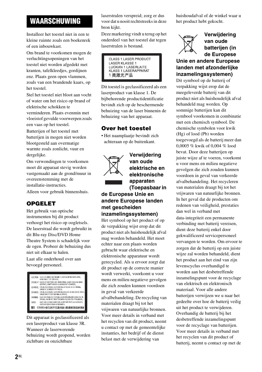 OPGELET Het gebruik van optische instrumenten bij dit product verhoogt het risico op oogletsels. De laserstraal die wordt gebruikt in dit Blu-ray Disc/DVD Home Theatre System is schadelijk voor de ogen. Probeer de behuizing dus niet uit elkaar te halen. Laat alle onderhoud over aan bevoegd personeel.
