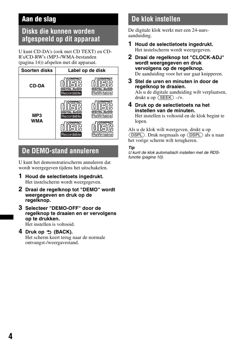 Aan de slag De klok instellen Disks die kunnen worden afgespeeld op dit apparaat U kunt CD-DA's (ook met CD TEXT) en CDR's/CD-RW's (MP3-/WMA-bestanden (pagina 14)) afspelen met dit apparaat. Soorten disks De digitale klok werkt met een 24-uursaanduiding.