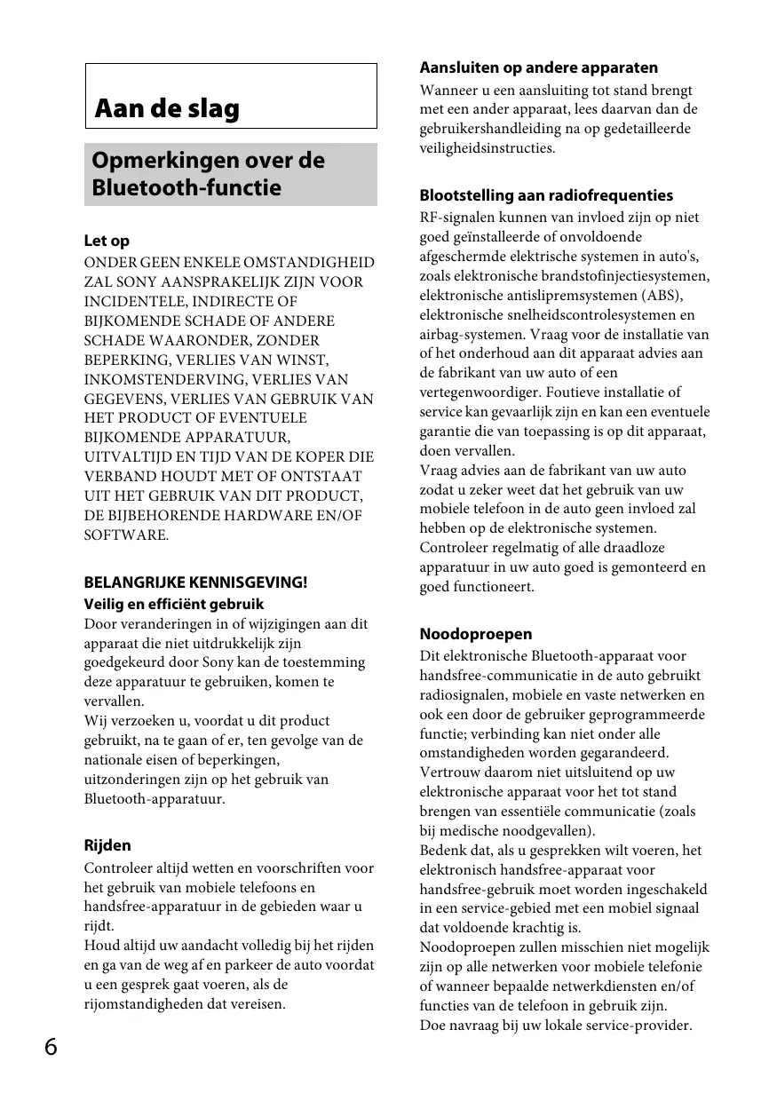 BELANGRIJKE KENNISGEVING! Veilig en efficiënt gebruik Door veranderingen in of wijzigingen aan dit apparaat die niet uitdrukkelijk zijn goedgekeurd door Sony kan de toestemming deze apparatuur te gebruiken, komen te vervallen. Wij verzoeken u, voordat u dit product gebruikt, na te gaan of er, ten gevolge van de nationale eisen of beperkingen, uitzonderingen zijn op het gebruik van Bluetooth-apparatuur.