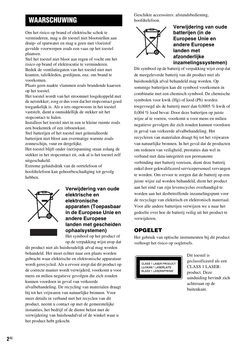 - Drücken Sie SHIFT + die Zahlentasten, SLOW, SLOW y, wenn Sie die Funktionen verwendet haben. 41DE WAARSCHUWING Om het risico op brand of elektrische schok te verminderen, mag u dit toestel niet blootstellen aan druip- of spatwater en mag u geen met vloeistof gevulde voorwerpen zoals een vaas op het toestel plaatsen. Stel het toestel niet bloot aan regen of vocht om het risico op brand of elektrocutie te verminderen. Bedek de ventilatiegaten van het toestel niet met kranten, tafelkleden, gordijnen, enz. om brand te voorkomen. Plaats geen naakte vlammen zoals brandende kaarsen op het toestel. Het toestel wordt van het stroomnet losgekoppeld met de netstekker; zorg er dus voor dat het stopcontact goed toegankelijk is. Als u iets ongewoons in het toestel vaststelt, dient u onmiddellijk de stekker uit het stopcontact te halen. Installeer het toestel niet in een te kleine ruimte zoals een boekenrek of een inbouwkast. Stel batterijen of het toestel met geïnstalleerde batterijen niet bloot aan overmatige warmte zoals zonneschijn, vuur en dergelijke. Het toestel blijft onder (net)spanning staan zolang de stekker in het stopcontact zit, ook al is het toestel zelf uitgeschakeld. Extreme geluidsdruk van de oortelefoon of hoofdtelefoon kan gehoorbeschadiging tot gevolg hebben. Verwijdering van oude elektrische en elektronische apparaten (Toepasbaar in de Europese Unie en andere Europese landen met gescheiden ophaalsystemen) Het symbool op het product of op de verpakking wijst erop dat dit product niet als huishoudelijk afval mag worden behandeld. Het moet echter naar een plaats worden gebracht waar elektrische en elektronische apparatuur wordt gerecycled. Als u ervoor zorgt dat dit product op de correcte manier wordt verwijderd, voorkomt u voor mens en milieu negatieve gevolgen die zich zouden kunnen voordoen in geval van verkeerde afvalbehandeling. De recycling van materialen draagt bij tot het vrijwaren van natuurlijke bronnen. Voor meer details in verband met het recyclen van dit product, neemt u contact op met de gemeentelijke instanties, het bedrijf of de dienst belast met de verwijdering van huishoudafval of de winkel waar u het product hebt gekocht. 2NL Geschikte accessoires: afstandsbediening, hoofdtelefoon. Verwijdering van oude batterijen (in de Europese Unie en andere Europese landen met afzonderlijke inzamelingssystemen) Dit symbool op de batterij of verpakking wijst erop dat de meegeleverde batterij van dit product niet als huishoudelijk afval behandeld mag worden. Op sommige batterijen kan dit symbool voorkomen in combinatie met een chemisch symbool. De chemische symbolen voor kwik (Hg) of lood (Pb) worden toegevoegd als de batterij meer dan 0,0005 % kwik of 0,004 % lood bevat. Door deze batterijen op juiste wijze af te voeren, voorkomt u voor mens en milieu negatieve gevolgen die zich zouden kunnen voordoen in geval van verkeerde afvalbehandeling. Het recycleren van materialen draagt bij tot het vrijwaren van natuurlijke bronnen. In het geval dat de producten om redenen van veiligheid, prestaties dan wel in verband met data-integriteit een permanente verbinding met batterij vereisen, dient deze batterij enkel door gekwalificeerd servicepersoneel vervangen te worden. Om ervoor te zorgen dat de batterij op een juiste wijze zal worden behandeld, dient het product aan het eind van zijn levenscyclus overhandigd te worden aan het desbetreffende inzamelingspunt voor de recyclage van elektrisch en elektronisch materiaal. Voor alle andere batterijen verwijzen we u naar het gedeelte over hoe de batterij veilig uit het product te verwijderen. OPGELET Het gebruik van optische instrumenten bij dit product verhoogt het risico op oogletsels. Dit toestel is geclassificeerd als een CLASS 1 LASERproduct. Deze aanduiding bevindt zich achteraan op de buitenkant. Mededeling voor klanten: De volgende informatie geldt enkel voor toestellen die worden verkocht in landen die de EU-richtlijnen toepassen. De fabricant van dit product is Sony Corporation, 1-7-1 Konan Minato-ku Tokyo, 108-0075 Japan. De geauthoriseerde vertegenwoordiging voor EMC en produkt veiligheid is Sony Deutschland GmbH, Hedelfinger Strasse 61, 70327 Stuttgart, Duitsland. Voor service- of garantiezaken verwijzen wij u graag naar de addressen in de afzonderlijke service/garantie documenten.