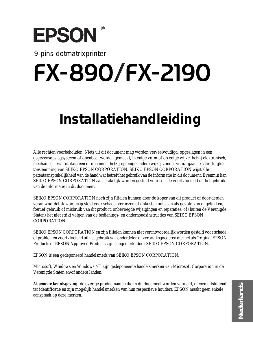 9-pins dotmatrixprinter Installatiehandleiding Alle rechten voorbehouden. Niets uit dit document mag worden verveelvoudigd, opgeslagen in een gegevensopslagsysteem of openbaar worden gemaakt, in enige vorm of op enige wijze, hetzij elektronisch, mechanisch, via fotokopieën of opnamen, hetzij op enige andere wijze, zonder voorafgaande schriftelijke toestemming van SEIKO EPSON CORPORATION. SEIKO EPSON CORPORATION wijst alle patentaansprakelijkheid van de hand wat betreft het gebruik van de informatie in dit document. Evenmin kan SEIKO EPSON CORPORATION aansprakelijk worden gesteld voor schade voortvloeiend uit het gebruik van de informatie in dit document. SEIKO EPSON CORPORATION noch zijn filialen kunnen door de koper van dit product of door derden verantwoordelijk worden gesteld voor schade, verliezen of onkosten ontstaan als gevolg van ongelukken, foutief gebruik of misbruik van dit product, onbevoegde wijzigingen en reparaties, of (buiten de Verenigde Staten) het niet strikt volgen van de bedienings- en onderhoudsinstructies van SEIKO EPSON CORPORATION. SEIKO EPSON CORPORATION en zijn filialen kunnen niet verantwoordelijk worden gesteld voor schade of problemen voortvloeiend uit het gebruik van onderdelen of verbruiksgoederen die niet als Original EPSON Products of EPSON Approved Products zijn aangemerkt door SEIKO EPSON CORPORATION. EPSON is een gedeponeerd handelsmerk van SEIKO EPSON CORPORATION. Algemene kennisgeving: de overige productnamen die in dit document worden vermeld, dienen uitsluitend ter identificatie en zijn mogelijk handelsmerken van hun respectieve houders. EPSON maakt geen enkele aanspraak op deze merken. Nederlands Microsoft, Windows en Windows NT zijn gedeponeerde handelsmerken van Microsoft Corporation in de Verenigde Staten en/of andere landen.