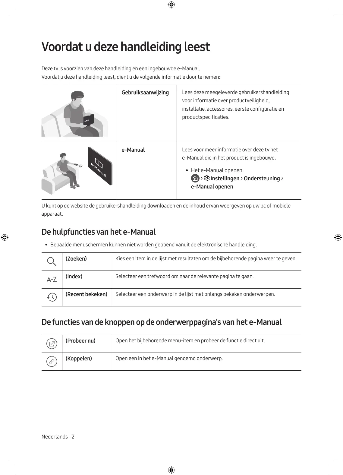 - • Het e-Manual openen: > Instellingen > Ondersteuning > e-Manual openen U kunt op de website de gebruikershandleiding downloaden en de inhoud ervan weergeven op uw pc of mobiele apparaat. De hulpfuncties van het e-Manual