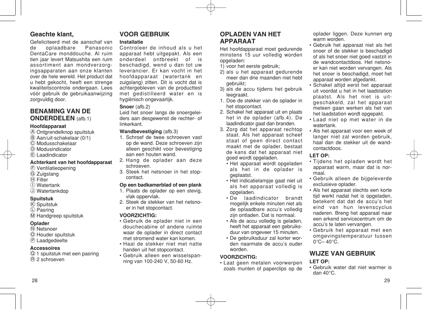 Gefeliciteerd met de aanschaf van de oplaadbare Panasonic DentaCare monddouce. Al ruim tien jaer levert Matsushita een ruim assortment aan mondverzorgingsapparaten aan onze klanten over de hele wereld. Het product dat u hebt gekocht, heeft een strenge kwaliteitis controle ondergaan. Lees voor gebruik de gebruikaanwijzing zorgvuldig door.