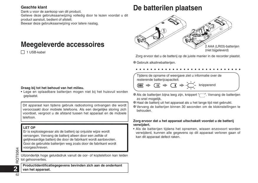 - Lege en oplaadbare batterijen mogen niet bij het huisvuil worden geplaatst. RQT9364 Dit apparaat kan tijdens gebruik radiostoring ontvangen die wordt veroorzaakt door mobiele telefoons. Als een dergelijke storing zich voordoet, vergroot u de afstand tussen het apparaat en de mobiele telefoon.