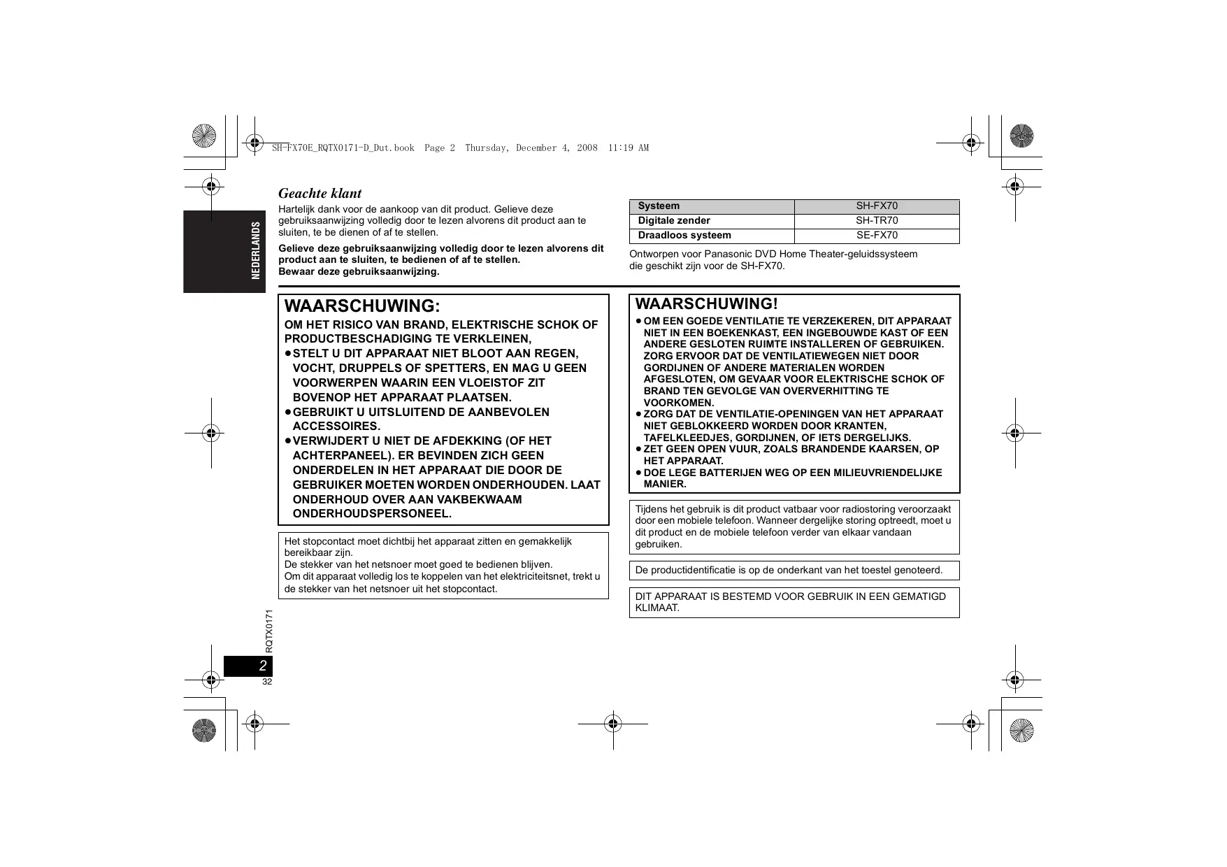 SH-FX70E_RQTX0171-D_Dut.book Page 2 Thursday, December 4, 2008 Geachte klant NEDERLANDS Hartelijk dank voor de aankoop van dit product. Gelieve deze gebruiksaanwijzing volledig door te lezen alvorens dit product aan te sluiten, te be dienen of af te stellen. Gelieve deze gebruiksaanwijzing volledig door te lezen alvorens dit product aan te sluiten, te bedienen of af te stellen. Bewaar deze gebruiksaanwijzing. WAARSCHUWING: OM HET RISICO VAN BRAND, ELEKTRISCHE SCHOK OF PRODUCTBESCHADIGING TE VERKLEINEN, ≥STELT U DIT APPARAAT NIET BLOOT AAN REGEN, VOCHT, DRUPPELS OF SPETTERS, EN MAG U GEEN