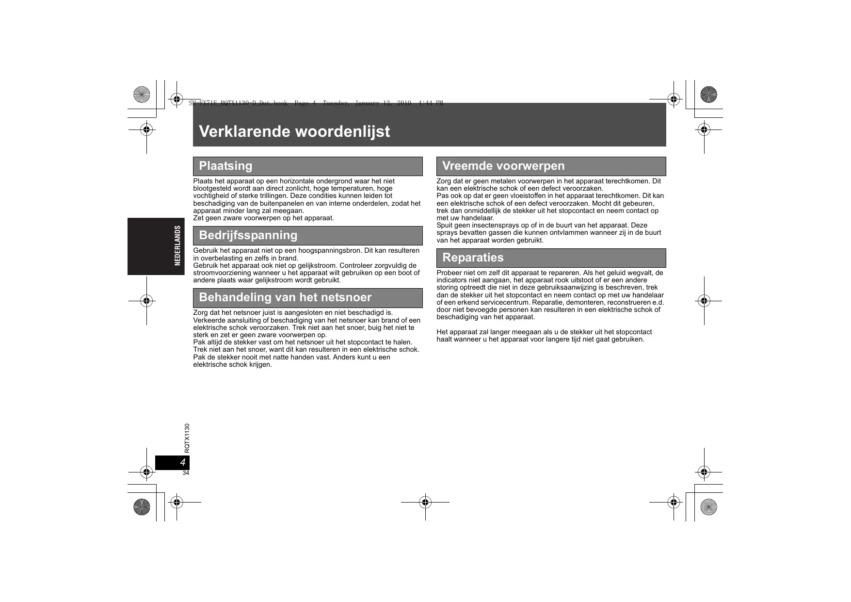 SH-FX71E_RQTX1130-D_Dut.book Page 4 Tuesday, January 12, 2010 4:44 PM Verklarende woordenlijst Plaatsing NEDERLANDS Plaats het apparaat op een horizontale ondergrond waar het niet blootgesteld wordt aan direct zonlicht, hoge temperaturen, hoge vochtigheid of sterke trillingen. Deze condities kunnen leiden tot beschadiging van de buitenpanelen en van interne onderdelen, zodat het apparaat minder lang zal meegaan. Zet geen zware voorwerpen op het apparaat. Bedrijfsspanning Gebruik het apparaat niet op een hoogspanningsbron. Dit kan resulteren in overbelasting en zelfs in brand. Gebruik het apparaat ook niet op gelijkstroom. Controleer zorgvuldig de stroomvoorziening wanneer u het apparaat wilt gebruiken op een boot of andere plaats waar gelijkstroom wordt gebruikt. Behandeling van het netsnoer RQTX1130 Zorg dat het netsnoer juist is aangesloten en niet beschadigd is. Verkeerde aansluiting of beschadiging van het netsnoer kan brand of een elektrische schok veroorzaken. Trek niet aan het snoer, buig het niet te sterk en zet er geen zware voorwerpen op. Pak altijd de stekker vast om het netsnoer uit het stopcontact te halen. Trek niet aan het snoer, want dit kan resulteren in een elektrische schok. Pak de stekker nooit met natte handen vast. Anders kunt u een elektrische schok krijgen.