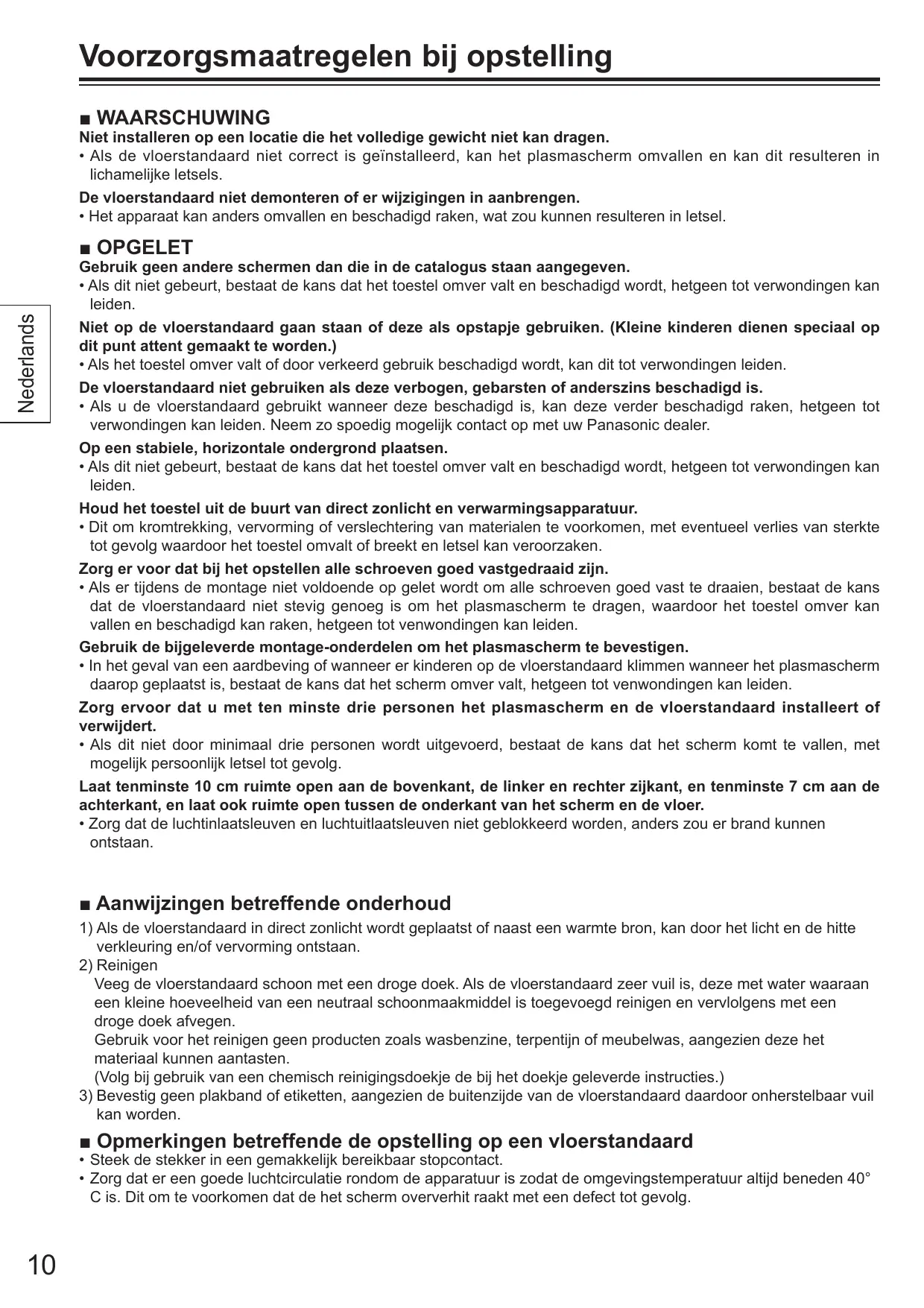 ■ OPGELET Gebruik geen andere schermen dan die in de catalogus staan aangegeven. • Als dit niet gebeurt, bestaat de kans dat het toestel omver valt en beschadigd wordt, hetgeen tot verwondingen kan leiden. Niet op de vloerstandaard gaan staan of deze als opstapje gebruiken. (Kleine kinderen dienen speciaal op dit punt attent gemaakt te worden.) • Als het toestel omver valt of door verkeerd gebruik beschadigd wordt, kan dit tot verwondingen leiden. De vloerstandaard niet gebruiken als deze verbogen, gebarsten of anderszins beschadigd is. • Als u de vloerstandaard gebruikt wanneer deze beschadigd is, kan deze verder beschadigd raken, hetgeen tot verwondingen kan leiden. Neem zo spoedig mogelijk contact op met uw Panasonic dealer. Op een stabiele, horizontale ondergrond plaatsen. • Als dit niet gebeurt, bestaat de kans dat het toestel omver valt en beschadigd wordt, hetgeen tot verwondingen kan leiden. Houd het toestel uit de buurt van direct zonlicht en verwarmingsapparatuur. • Dit om kromtrekking, vervorming of verslechtering van materialen te voorkomen, met eventueel verlies van sterkte tot gevolg waardoor het toestel omvalt of breekt en letsel kan veroorzaken. Zorg er voor dat bij het opstellen alle schroeven goed vastgedraaid zijn. • Als er tijdens de montage niet voldoende op gelet wordt om alle schroeven goed vast te draaien, bestaat de kans dat de vloerstandaard niet stevig genoeg is om het plasmascherm te dragen, waardoor het toestel omver kan vallen en beschadigd kan raken, hetgeen tot venwondingen kan leiden. Gebruik de bijgeleverde montage-onderdelen om het plasmascherm te bevestigen. • In het geval van een aardbeving of wanneer er kinderen op de vloerstandaard klimmen wanneer het plasmascherm daarop geplaatst is, bestaat de kans dat het scherm omver valt, hetgeen tot venwondingen kan leiden. Zorg ervoor dat u met ten minste drie personen het plasmascherm en de vloerstandaard installeert of verwijdert. • Als dit niet door minimaal drie personen wordt uitgevoerd, bestaat de kans dat het scherm komt te vallen, met mogelijk persoonlijk letsel tot gevolg. Laat tenminste 10 cm ruimte open aan de bovenkant, de linker en rechter zijkant, en tenminste 7 cm aan de achterkant, en laat ook ruimte open tussen de onderkant van het scherm en de vloer. • Zorg dat de luchtinlaatsleuven en luchtuitlaatsleuven niet geblokkeerd worden, anders zou er brand kunnen ontstaan.