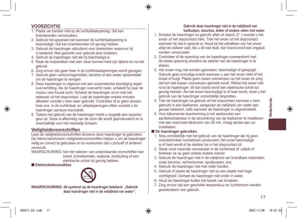 geur op. Deze is afkomstig van de ozon die wordt geproduceerd en is onschadelijk voor het menselijk lichaam. Veiligheidsvoorschriften Lees de veiligheidsvoorschriften alvorens deze haardroger te gebruiken. De hierna beschreven veiligheidsvoorschriften helpen u om de haardroger veilig en correct te gebruiken en te voorkomen dat u zichzelf of anderen verwondt. WAARSCHUWING: het niet naleven van onderstaande voorschriften kan brand, brandwonden, explosie, kortsluiting of een elektrische schok tot gevolg hebben. Elektriciteitscondities WAARSCHUWING: dit symbool op de haardroger betekent: „Gebruik deze haardroger niet in de nabijheid van water”. Gebruik deze haardroger niet in de nabijheid van badkuipen, douches, teilen of andere vaten met water.