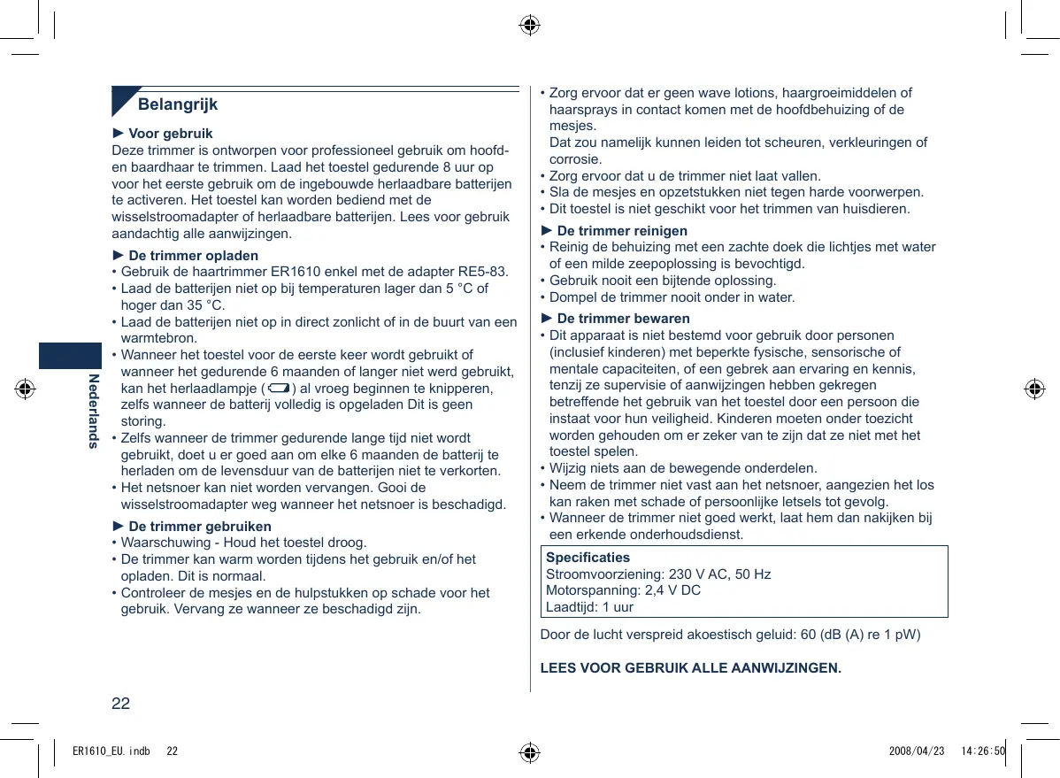 Zelfs wonneer de trimmer gedurende langeijd nicht worden gebruikt, doet u er goed aan om elke 6 maanden de batterij te herladen om de levensduur van de batterijen Niet te verkorten. - Het netsnoer kan nicht worden verrangen. Gooi de wisselstroomadapter weg wonneer het netsnoer is beschadigd.