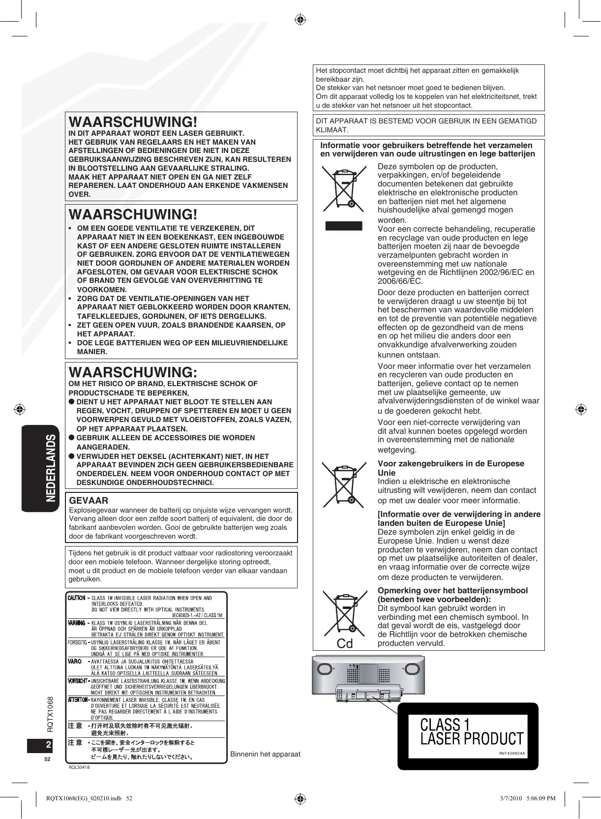 RQTX1068(EG)_020210.indb 51 3/7/2010 5:06:06 PM Het stopcontact moet dichtbij het apparaat zitten en gemakkelijk bereikbaar zijn. De stekker van het netsnoer moet goed te bedienen blijven. Om dit apparaat volledig los te koppelen van het elektriciteitsnet, trekt u de stekker van het netsnoer uit het stopcontact. WAARSCHUWING! IN DIT APPARAAT WORDT EEN LASER GEBRUIKT. HET GEBRUIK VAN REGELAARS EN HET MAKEN VAN AFSTELLINGEN OF BEDIENINGEN DIE NIET IN DEZE