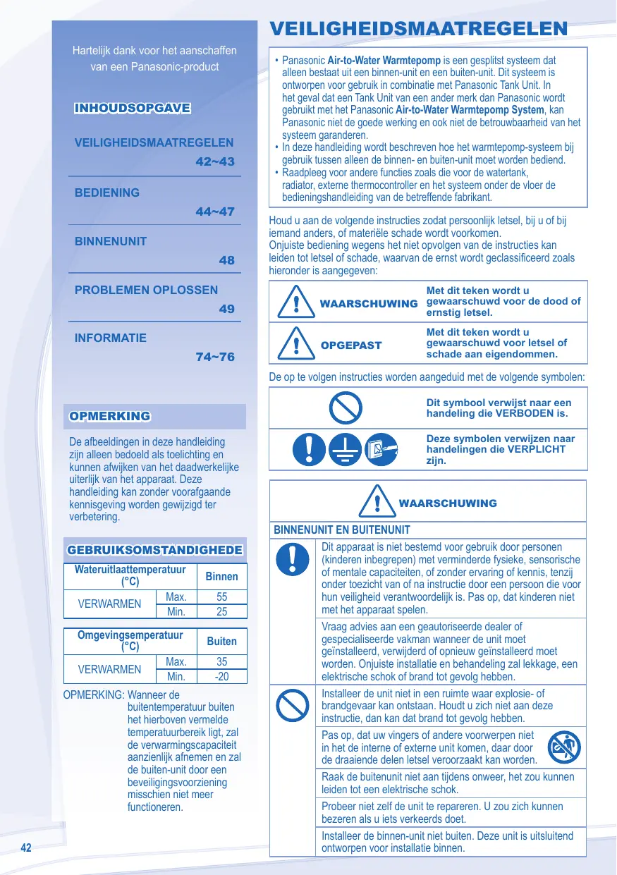 VEILIGHEIDSMAATREGELEN Hartelijk dank voor het aanschaffen van een Panasonic-product INHOUDSOPGAVE VEILIGHEIDSMAATREGELEN 42~43 BEDIENING 44~47 BINNENUNIT 48 PROBLEMEN OPLOSSEN 49 INFORMATIE 74~76