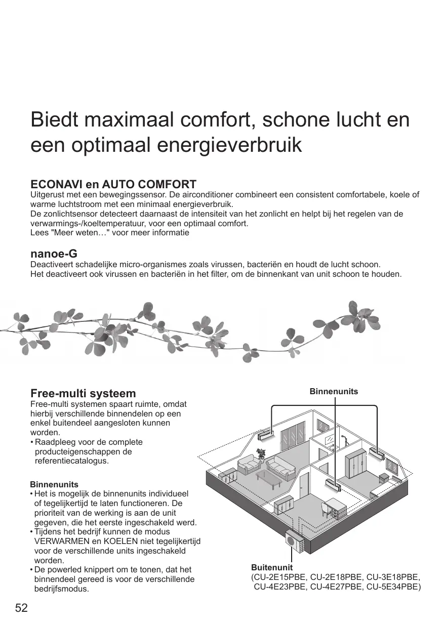 Biedt maximaal comfort, schone lucht en een optimaal energieverbruik ECONAVI en AUTO COMFORT Uitgerust met een bewegingssensor. De airconditioner combineert een consistent comfortabele, koele of warme luchtstroom met een minimaal energieverbruik. De zonlichtsensor detecteert daarnaast de intensiteit van het zonlicht en helpt bij het regelen van de verwarmings-/koeltemperatuur, voor een optimaal comfort. Lees "Meer weten…" voor meer informatie nanoe-G Deactiveert schadelijke micro-organismes zoals virussen, bacteriën en houdt de lucht schoon. Het deactiveert ook virussen en bacteriën in het filter, om de binnenkant van unit schoon te houden. Free-multi systeem Binnenunits Free-multi systemen spaart ruimte, omdat hierbij verschillende binnendelen op een enkel buitendeel aangesloten kunnen worden.