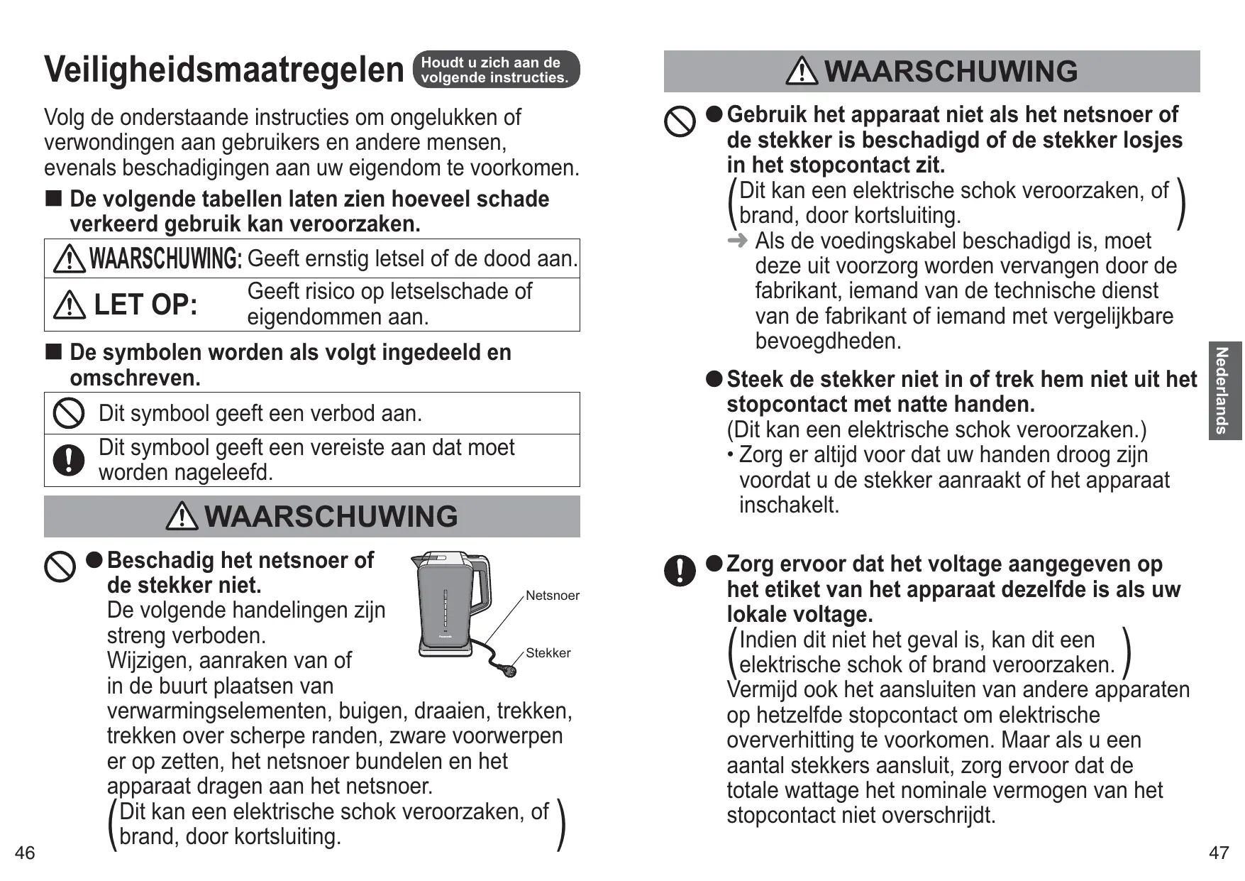 gekrast of gescheurd is. Als de waterkoker wordt gekanteld of omgestoten, kan dit heet water morsen, wat brandwonden kan veroorzaken. Voor vervanging, raadpleeg de plaats van aankoop of een Panasonic service center.