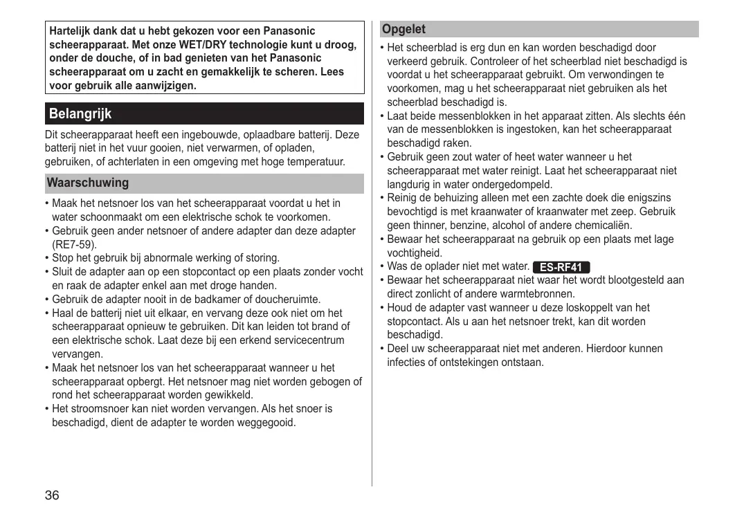 - Omdat dit een oplaadbaar model is, kan het niet worden gebruikt wanneer het is aangesloten op een stopcontact. Gebruik het scheerapparaat met de adapter losgekoppeld nadat deze volledig is opgeladen. Service Contact Bezoek de website van Panasonic op http://panasonic.net, of neem contact op met een erkende onderhoudsdienst (het adres vindt u in het Pan-Europese garantieboekje) als u informatie nodig hebt of het scheerapparaat of het stroomsnoer beschadigd is. Vervangende onderdelen Vervangende onderdelen zijn verkrijgbaar bij uw dealer of servicecentrum. Vervangende onderdelen voor ES‑RF41/ES-RF31 Olie