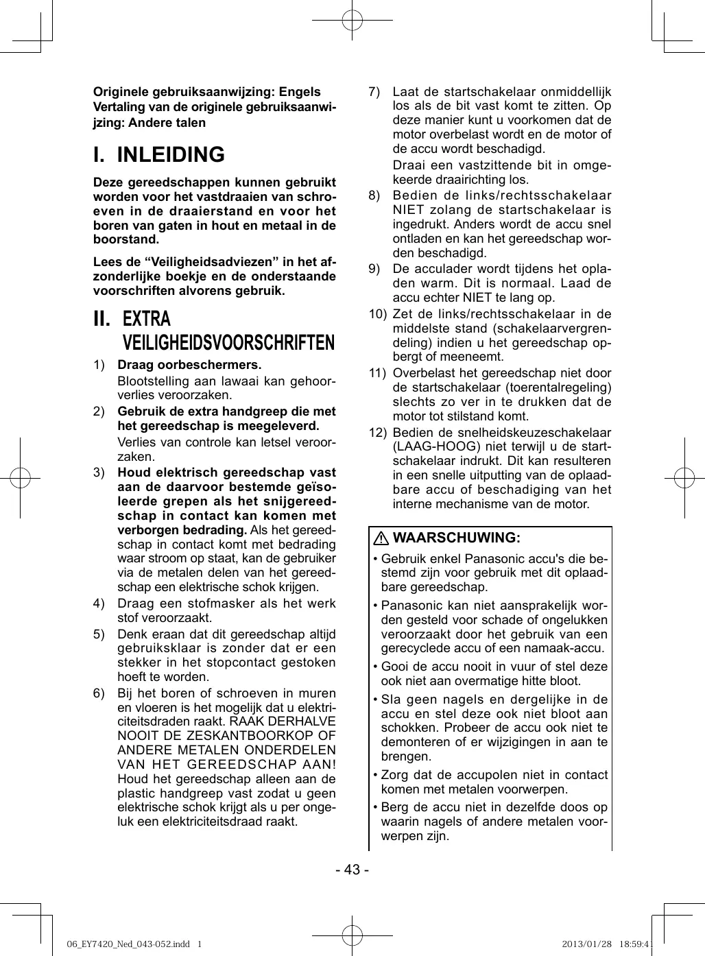 - Gebruik enkel Panasonic accu's die bestemd zijn voor gebruik met dit oplaadbare gereedschap.