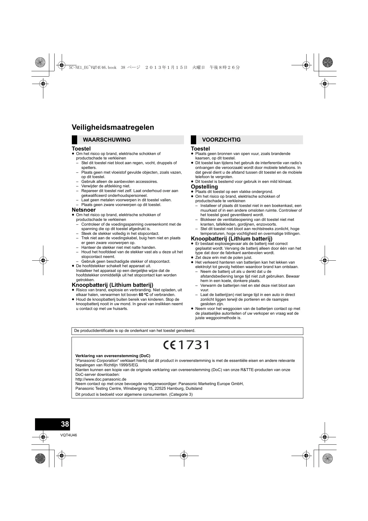 Verklaring van overeenstemming (DoC) “Panasonic Corporation” verklaart hierbij dat dit product in overeenstemming is met de essentiële eisen en andere relevante bepalingen van Richtlijn 1999/5/EG. Klanten kunnen een kopie van de originele verklaring van overeenstemming (DoC) van onze R&TTE-producten van onze DoC-server downloaden: http://www.doc.panasonic.de Neem contact op met onze bevoegde vertegenwoordiger: Panasonic Marketing Europe GmbH, Panasonic Testing Centre, Winsbergring 15, 22525 Hamburg, Duitsland Dit product is bedoeld voor algemene consumenten. (Categorie 3)