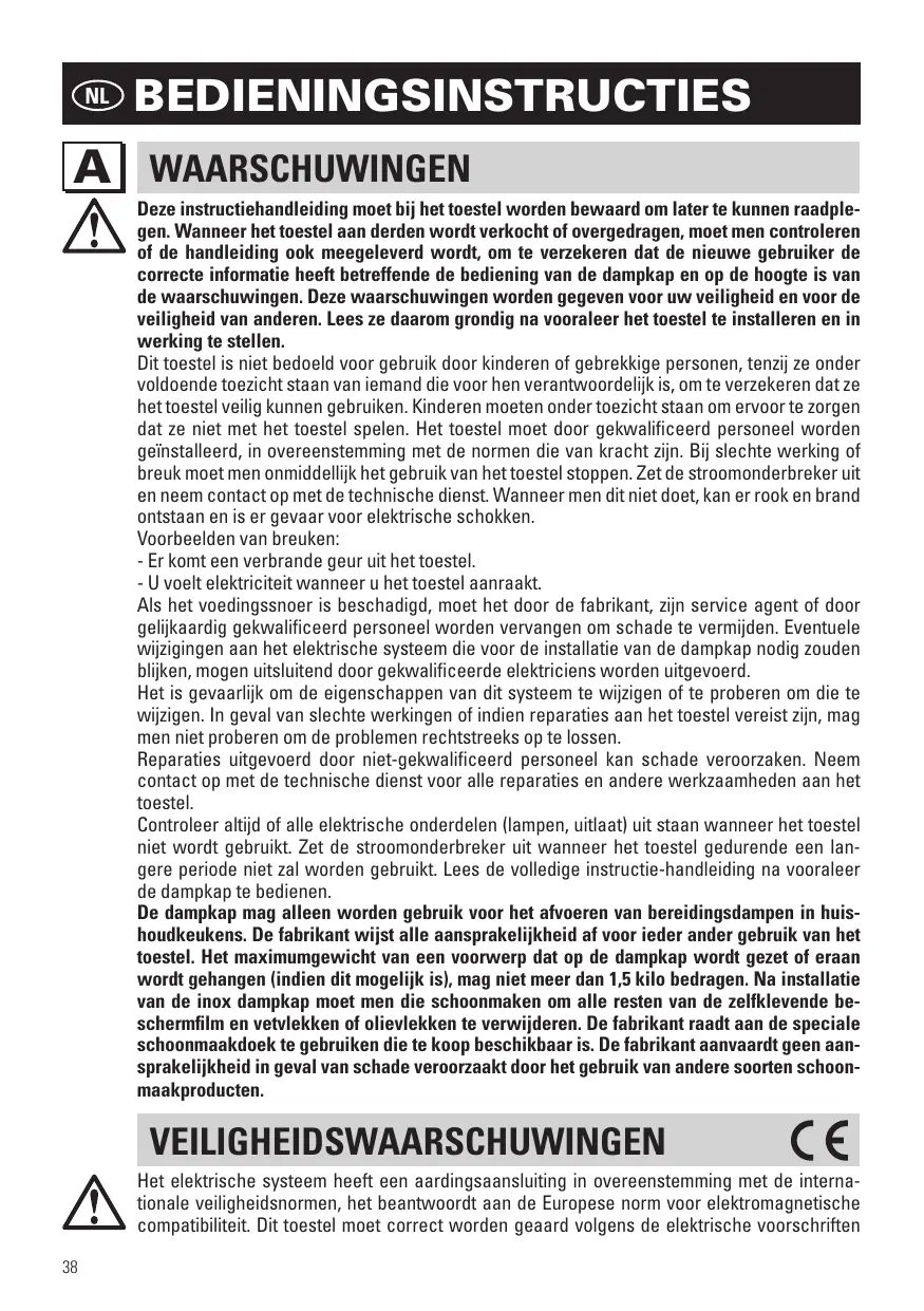 BEDIENINGSINSTRUCTIES A WAARSCHUWINGEN Deze instructiehandleiding moet bij het toestel worden bewaard om later te kunnen raadplegen. Wanneer het toestel aan derden wordt verkocht of overgedragen, moet men controleren of de handleiding ook meegeleverd wordt, om te verzekeren dat de nieuwe gebruiker de correcte informatie heeft betreffende de bediening van de dampkap en op de hoogte is van de waarschuwingen. Deze waarschuwingen worden gegeven voor uw veiligheid en voor de veiligheid van anderen. Lees ze daarom grondig na vooraleer het toestel te installeren en in werking te stellen. Dit toestel is niet bedoeld voor gebruik door kinderen of gebrekkige personen, tenzij ze onder voldoende toezicht staan van iemand die voor hen verantwoordelijk is, om te verzekeren dat ze het toestel veilig kunnen gebruiken. Kinderen moeten onder toezicht staan om ervoor te zorgen dat ze niet met het toestel spelen. Het toestel moet door gekwalificeerd personeel worden geïnstalleerd, in overeenstemming met de normen die van kracht zijn. Bij slechte werking of breuk moet men onmiddellijk het gebruik van het toestel stoppen. Zet de stroomonderbreker uit en neem contact op met de technische dienst. Wanneer men dit niet doet, kan er rook en brand ontstaan en is er gevaar voor elektrische schokken. Voorbeelden van breuken: - Er komt een verbrande geur uit het toestel. - U voelt elektriciteit wanneer u het toestel aanraakt. Als het voedingssnoer is beschadigd, moet het door de fabrikant, zijn service agent of door gelijkaardig gekwalificeerd personeel worden vervangen om schade te vermijden. Eventuele wijzigingen aan het elektrische systeem die voor de installatie van de dampkap nodig zouden blijken, mogen uitsluitend door gekwalificeerde elektriciens worden uitgevoerd. Het is gevaarlijk om de eigenschappen van dit systeem te wijzigen of te proberen om die te wijzigen. In geval van slechte werkingen of indien reparaties aan het toestel vereist zijn, mag men niet proberen om de problemen rechtstreeks op te lossen. Reparaties uitgevoerd door niet-gekwalificeerd personeel kan schade veroorzaken. Neem contact op met de technische dienst voor alle reparaties en andere werkzaamheden aan het toestel. Controleer altijd of alle elektrische onderdelen (lampen, uitlaat) uit staan wanneer het toestel niet wordt gebruikt. Zet de stroomonderbreker uit wanneer het toestel gedurende een langere periode niet zal worden gebruikt. Lees de volledige instructie-handleiding na vooraleer de dampkap te bedienen. De dampkap mag alleen worden gebruik voor het afvoeren van bereidingsdampen in huishoudkeukens. De fabrikant wijst alle aansprakelijkheid af voor ieder ander gebruik van het toestel. Het maximumgewicht van een voorwerp dat op de dampkap wordt gezet of eraan wordt gehangen (indien dit mogelijk is), mag niet meer dan 1,5 kilo bedragen. Na installatie van de inox dampkap moet men die schoonmaken om alle resten van de zelfklevende beschermfilm en vetvlekken of olievlekken te verwijderen. De fabrikant raadt aan de speciale schoonmaakdoek te gebruiken die te koop beschikbaar is. De fabrikant aanvaardt geen aansprakelijkheid in geval van schade veroorzaakt door het gebruik van andere soorten schoonmaakproducten. VEILIGHEIDSWAARSCHUWINGEN Het elektrische systeem heeft een aardingsaansluiting in overeenstemming met de internationale veiligheidsnormen, het beantwoordt aan de Europese norm voor elektromagnetische compatibiliteit. Dit toestel moet correct worden geaard volgens de elektrische voorschriften