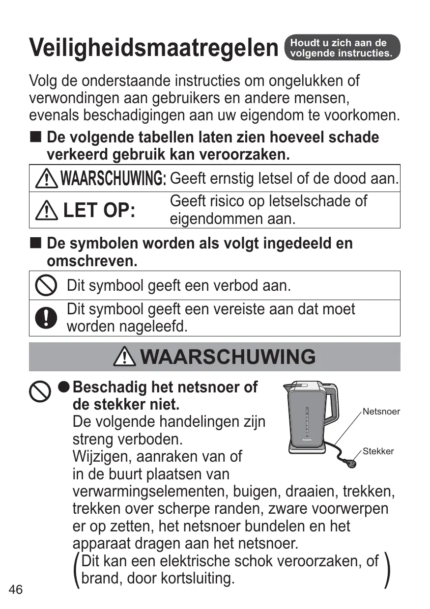 Veiligheidsmaatregelen Houdt u zich aan de volgende instructies. Volg de onderstaande instructies om ongelukken of verwondingen aan gebruikers en andere mensen, evenals beschadigingen aan uw eigendom te voorkomen. De volgende tabellen laten zien hoeveel schade verkeerd gebruik kan veroorzaken. WAARSCHUWING: Geeft ernstig letsel of de dood aan. Geeft risico op letselschade of LET OP: eigendommen aan. De symbolen worden als volgt ingedeeld en omschreven. Dit symbool geeft een verbod aan. Dit symbool geeft een vereiste aan dat moet worden nageleefd. WAARSCHUWING Beschadig het netsnoer of de stekker niet. Netsnoer De volgende handelingen zijn streng verboden. Stekker Wijzigen, aanraken van of in de buurt plaatsen van verwarmingselementen, buigen, draaien, trekken, trekken over scherpe randen, zware voorwerpen er op zetten, het netsnoer bundelen en het apparaat dragen aan het netsnoer. Dit kan een elektrische schok veroorzaken, of brand, door kortsluiting. Max