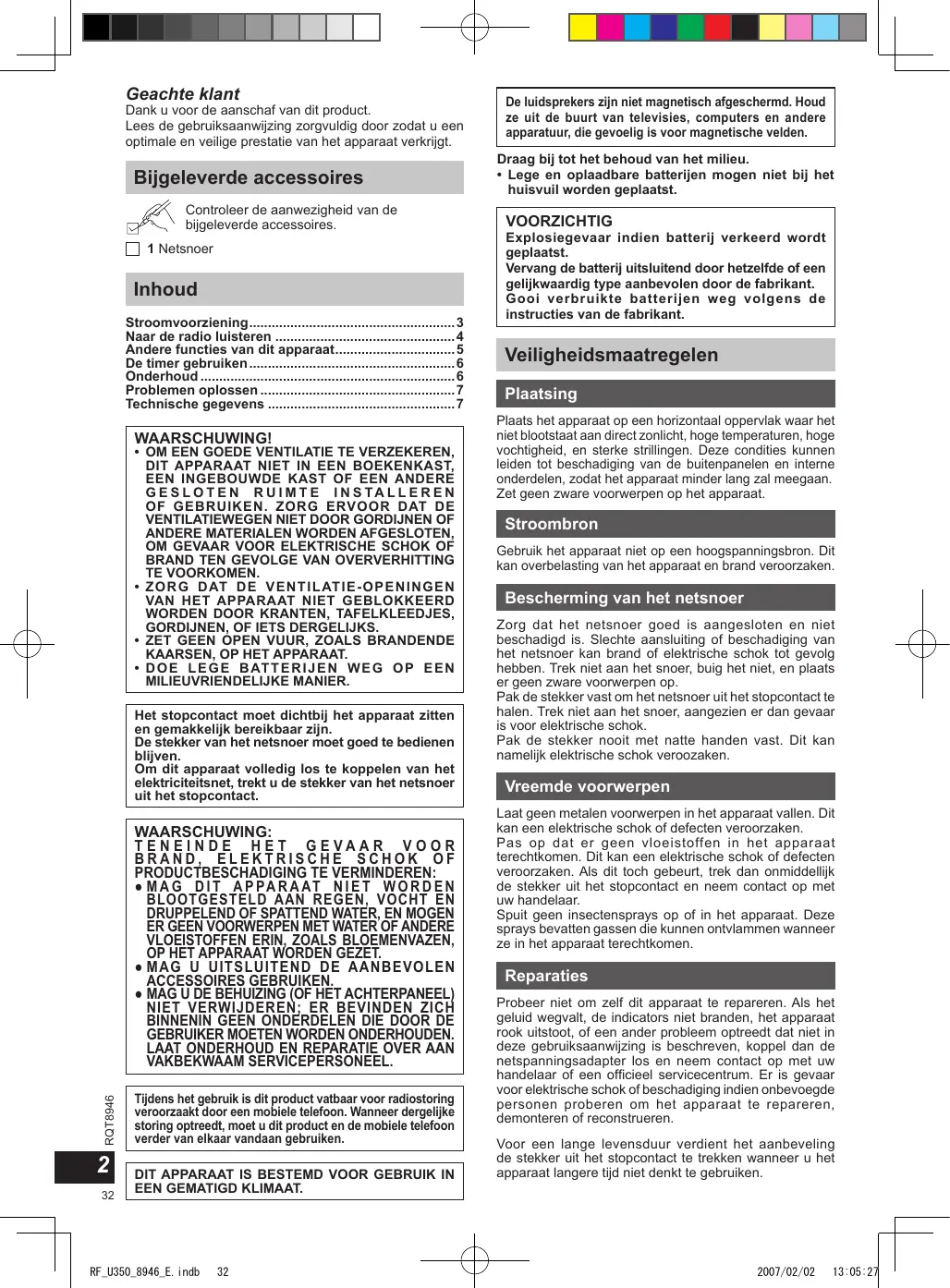 2007/02/02 13:05:36 De timer gebruiken U kunt de tijdstippen instellen waarop u het apparaat wilt in- en uitschakelen, en de zender en het volumeniveau wilt instellen, terwijl het apparaat is ingeschakeld. Voorbereiding: De klok instellen. ( zie blz. 5) Kiezen van de zender. zie blz. 4) Instellen van het volumeniveau. zie blz. 4)