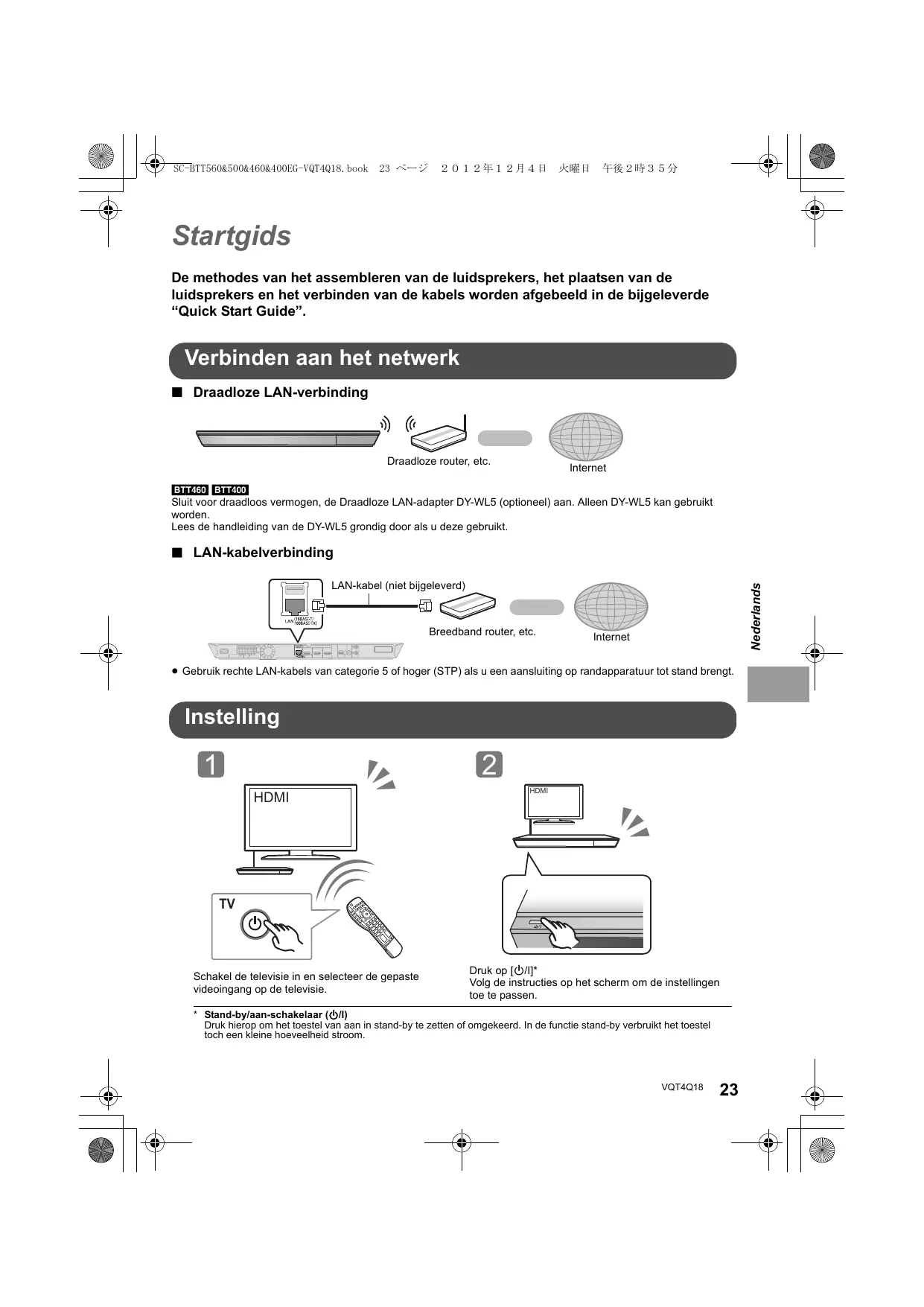 Startgids De methodes van het assembleren van de luidsprekers, het plaatsen van de luidsprekers en het verbinden van de kabels worden afgebeeld in de bijgeleverde “Quick Start Guide”. Verbinden aan het netwerk ∫ Draadloze LAN-verbinding Draadloze router, etc. Internet [BTT460] [BTT400] Sluit voor draadloos vermogen, de Draadloze LAN-adapter DY-WL5 (optioneel) aan. Alleen DY-WL5 kan gebruikt worden. Lees de handleiding van de DY-WL5 grondig door als u deze gebruikt. ∫ LAN-kabelverbinding Breedband router, etc. Nederlands LAN-kabel (niet bijgeleverd) Internet ≥ Gebruik rechte LAN-kabels van categorie 5 of hoger (STP) als u een aansluiting op randapparatuur tot stand brengt. Instelling