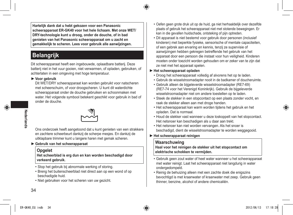 2012/06/13 17:18:27 Hartelijk dank dat u hebt gekozen voor een Panasonic scheerapparaat ER‑GK40 voor het hele lichaam. Met onze WET/ DRY-technologie kunt u droog, onder de douche, of in bad genieten van het Panasonic scheerapparaat om u zacht en gemakkelijk te scheren. Lees voor gebruik alle aanwijzingen. Belangrijk Dit scheerapparaat heeft een ingebouwde, oplaadbare batterij. Deze batterij niet in het vuur gooien, niet verwarmen, of opladen, gebruiken, of achterlaten in een omgeving met hoge temperatuur. ► Voor gebruik Dit WET/DRY scheerapparaat kan worden gebruikt voor natscheren met scheerschuim, of voor droogscheren. U kunt dit waterdichte scheerapparaat onder de douche gebruiken en schoonmaken met water. Het volgende symbool betekent geschikt voor gebruik in bad of onder de douche. Nederlands Ons onderzoek heeft aangetoond dat u kunt genieten van een strakkere en zachtere scheerbeurt dankzij de scherpe mesjes. En dankzij de uitklapbare trimmer kunt u langere haren met gemak scheren. ► Gebruik van het scheerapparaat Opgelet Het scheerblad is erg dun en kan worden beschadigd door verkeerd gebruik.
