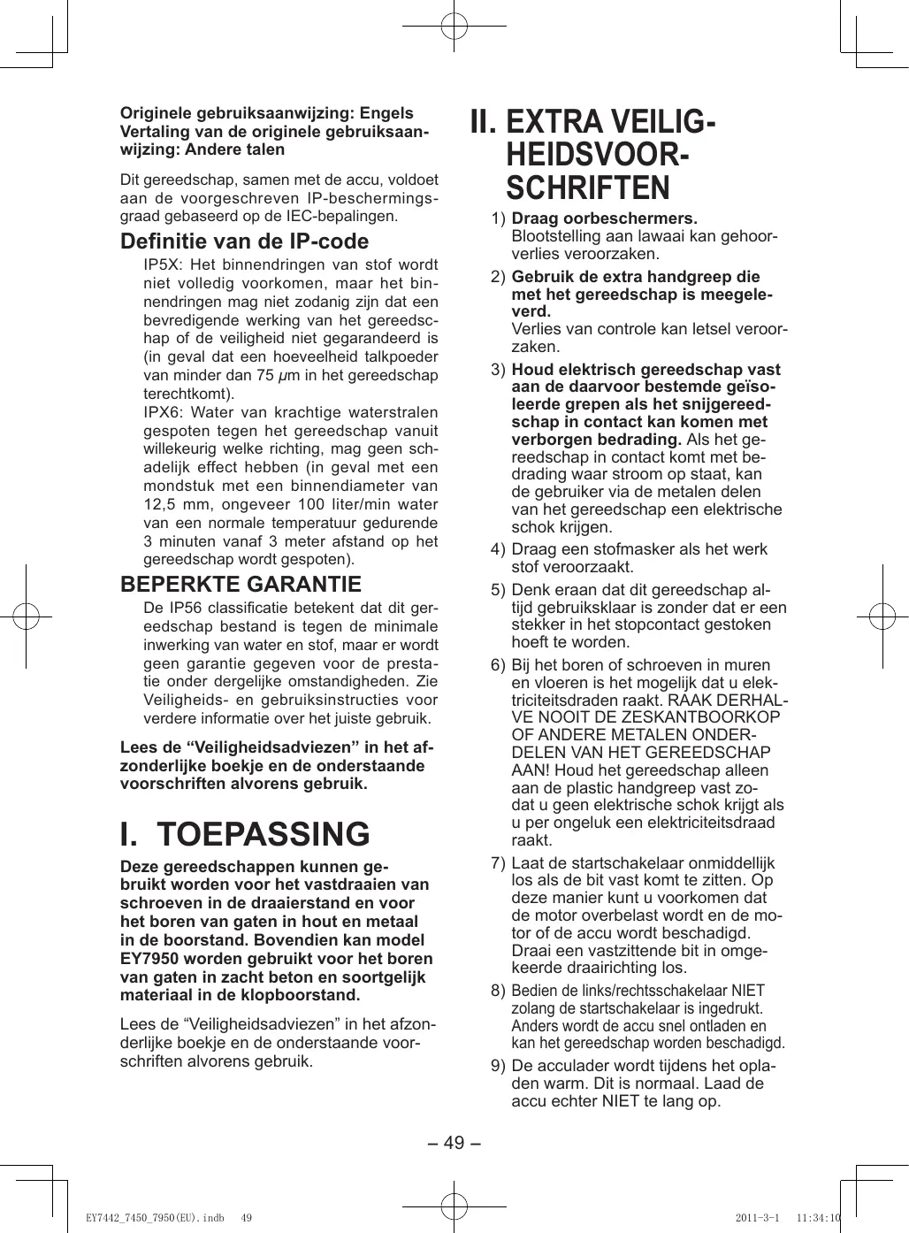 Definitie van de IP-code IP5X: Het binnendringen van stof wordt niet volledig voorkomen, maar het binnendringen mag niet zodanig zijn dat een bevredigende werking van het gereedschap of de veiligheid niet gegarandeerd is (in geval dat een hoeveelheid talkpoeder van minder dan 75 μm in het gereedschap terechtkomt). IPX6: Water van krachtige waterstralen gespoten tegen het gereedschap vanuit willekeurig welke richting, mag geen schadelijk effect hebben (in geval met een mondstuk met een binnendiameter van 12,5 mm, ongeveer 100 liter/min water van een normale temperatuur gedurende 3 minuten vanaf 3 meter afstand op het gereedschap wordt gespoten). BEPERKTE GARANTIE De IP56 classificatie betekent dat dit gereedschap bestand is tegen de minimale inwerking van water en stof, maar er wordt geen garantie gegeven voor de prestatie onder dergelijke omstandigheden. Zie Veiligheids- en gebruiksinstructies voor verdere informatie over het juiste gebruik. Lees de “Veiligheidsadviezen” in het afzonderlijke boekje en de onderstaande voorschriften alvorens gebruik.