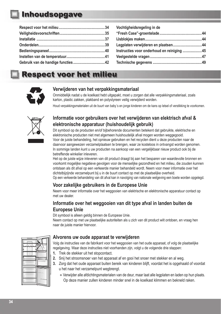 2. Coupez le cordon d’alimentation et jetez-le de manière appropriée et sûre avec la fiche électrique toujours attachée. 3. Assurez-vous que l’ancien appareil est hors de portée des jeunes enfants pendant la période de stockage précédant sa mise au rebut ou avant son transport vers un Centre de recyclage. ● Retirez toutes les garnitures d’étanchéité de la porte et laissez les étagères et les tiroirs en place. Ainsi, les enfants ne pourront pas facilement grimper à l’intérieur de l’équipement et s’enfermer. 50