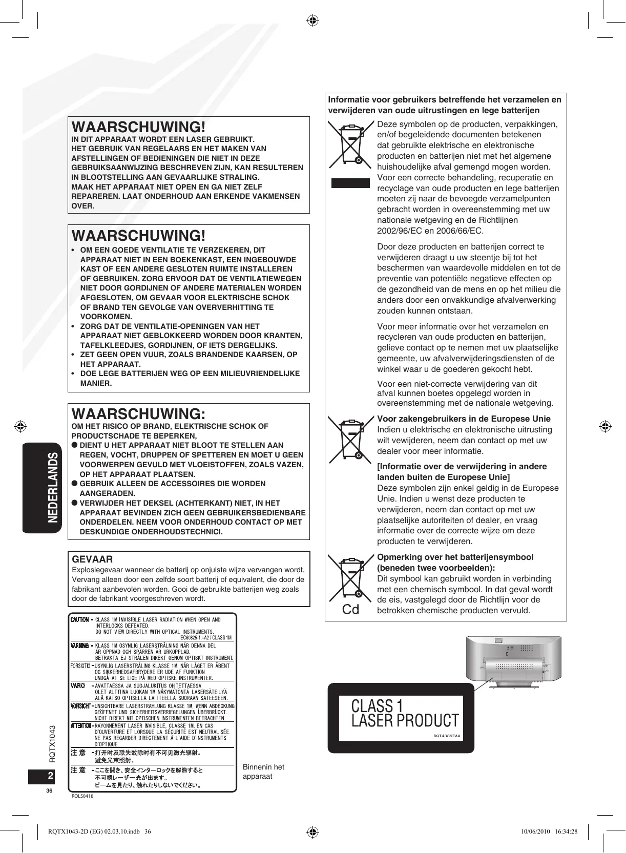RQTX1043-2D (EG) 02.03.10.indb 35 10/06/2010 16:34:25 Informatie voor gebruikers betreffende het verzamelen en verwijderen van oude uitrustingen en lege batterijen WAARSCHUWING! IN DIT APPARAAT WORDT EEN LASER GEBRUIKT. HET GEBRUIK VAN REGELAARS EN HET MAKEN VAN AFSTELLINGEN OF BEDIENINGEN DIE NIET IN DEZE
