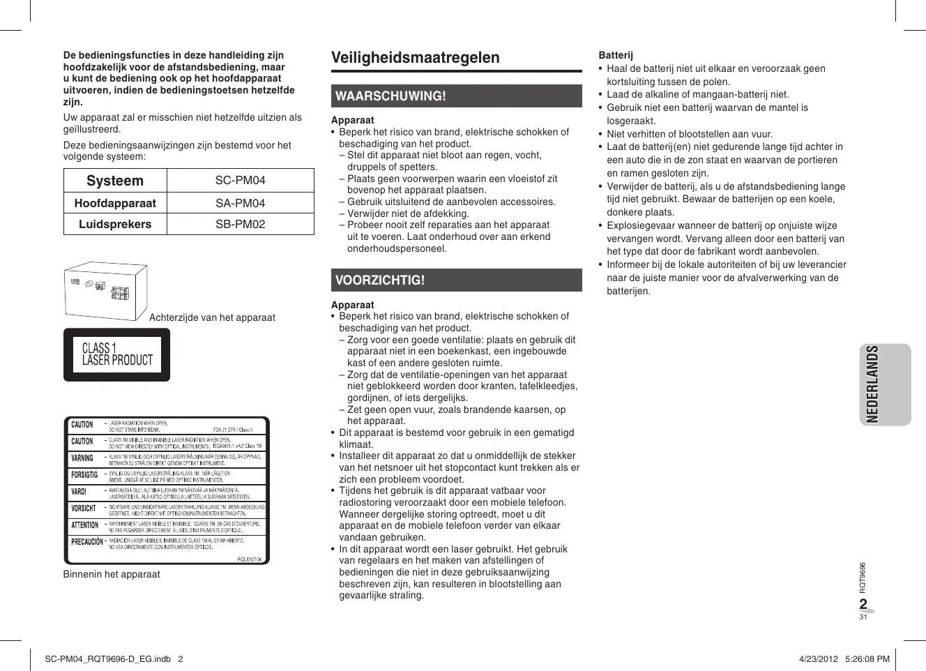 - Beperk het risico van brand, elektrische schokken of beschadiging van het product. – Stel dit apparaat niet bloot aan regen, vocht, druppels of spetters. – Plaats geen voorwerpen waarin een vloeistof zit bovenop het apparaat plaatsen. – Gebruik uitsluitend de aanbevolen accessoires. – Verwijder niet de afdekking. – Probeer nooit zelf reparaties aan het apparaat uit te voeren. Laat onderhoud over aan erkend onderhoudspersoneel. Deze bedieningsaanwijzingen zijn bestemd voor het volgende systeem: Systeem SC-PM04 Hoofdapparaat SA-PM04 Luidsprekers SB-PM02 WAARSCHUWING! VOORZICHTIG! Achterzijde van het apparaat Binnenin het apparaat Apparaat