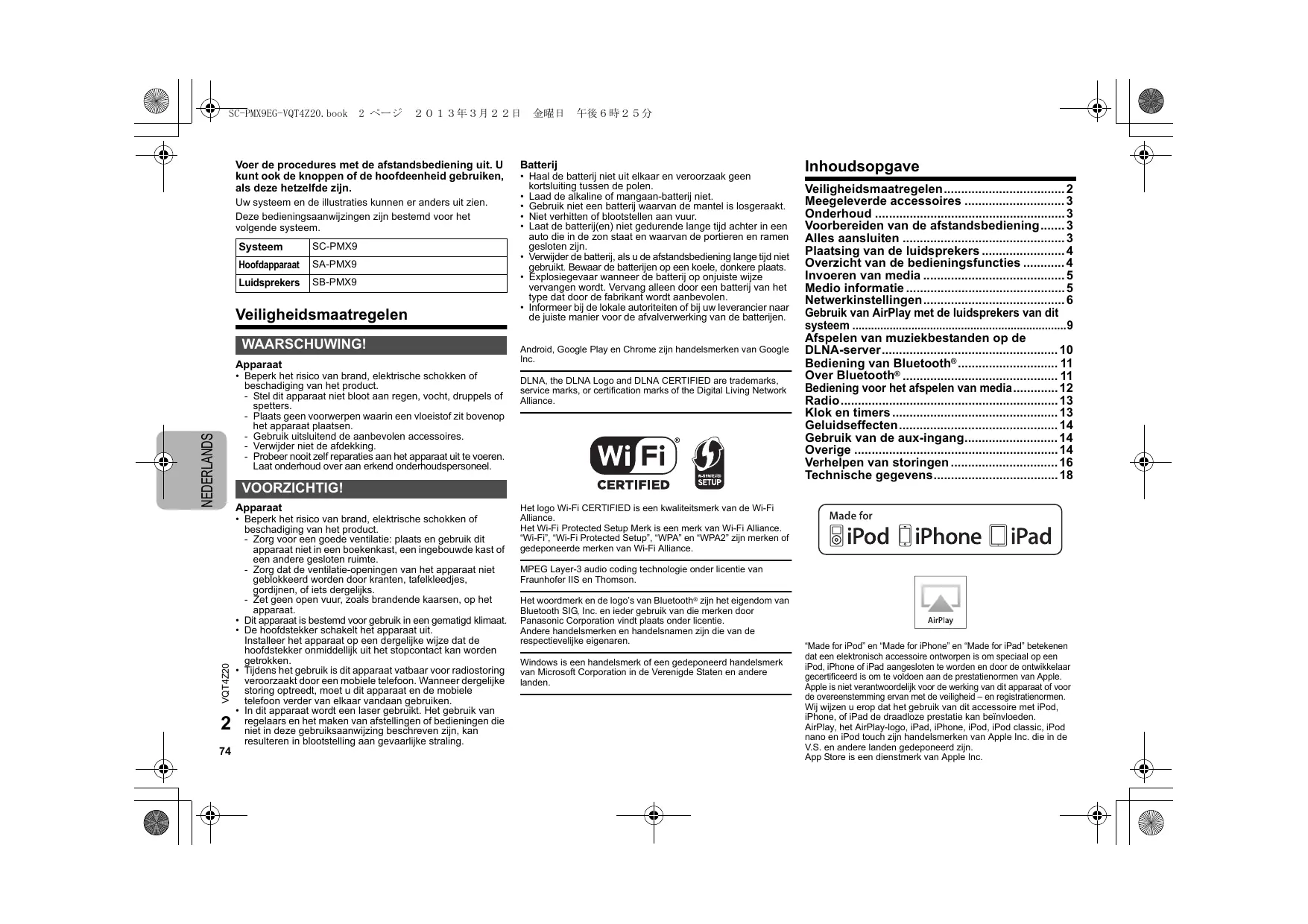 - In dit apparaat wordt een laser gebruikt. Het gebruik van regelaars en het maken van afstellingen of bedieningen die niet in deze gebruiksaanwijzing beschreven zijn, kan resulteren in blootstelling aan gevaarlijke straling. Inhoudsopgave Veiligheidsmaatregelen................................... 2 Meegeleverde accessoires ............................. 3 Onderhoud ....................................................... 3 Voorbereiden van de afstandsbediening....... 3 Alles aansluiten ............................................... 3 Plaatsing van de luidsprekers ........................ 4 Overzicht van de bedieningsfuncties ............ 4 Invoeren van media ......................................... 5 Medio informatie .............................................. 5 Netwerkinstellingen......................................... 6 Gebruik van AirPlay met de luidsprekers van dit systeem .....................................................................9 Afspelen van muziekbestanden op de DLNA-server................................................... 10 Bediening van Bluetooth® ............................. 11 Over Bluetooth® ............................................. 11 Bediening voor het afspelen van media............. 12 Radio............................................................... 13 Klok en timers ................................................ 13 Geluidseffecten.............................................. 14 Gebruik van de aux-ingang........................... 14 Overige ........................................................... 14 Verhelpen van storingen ............................... 16 Technische gegevens.................................... 18 Het logo Wi-Fi CERTIFIED is een kwaliteitsmerk van de Wi-Fi Alliance. Het Wi-Fi Protected Setup Merk is een merk van Wi-Fi Alliance. “Wi-Fi”, “Wi-Fi Protected Setup”, “WPA” en “WPA2” zijn merken of gedeponeerde merken van Wi-Fi Alliance. MPEG Layer-3 audio coding technologie onder licentie van Fraunhofer IIS en Thomson. Het woordmerk en de logo’s van Bluetooth® zijn het eigendom van Bluetooth SIG, Inc. en ieder gebruik van die merken door Panasonic Corporation vindt plaats onder licentie. Andere handelsmerken en handelsnamen zijn die van de respectievelijke eigenaren. Windows is een handelsmerk of een gedeponeerd handelsmerk van Microsoft Corporation in de Verenigde Staten en andere landen. “Made for iPod” en “Made for iPhone” en “Made for iPad” betekenen dat een elektronisch accessoire ontworpen is om speciaal op een iPod, iPhone of iPad aangesloten te worden en door de ontwikkelaar gecertificeerd is om te voldoen aan de prestatienormen van Apple. Apple is niet verantwoordelijk voor de werking van dit apparaat of voor de overeenstemming ervan met de veiligheid – en registratienormen. Wij wijzen u erop dat het gebruik van dit accessoire met iPod, iPhone, of iPad de draadloze prestatie kan beïnvloeden. AirPlay, het AirPlay-logo, iPad, iPhone, iPod, iPod classic, iPod nano en iPod touch zijn handelsmerken van Apple Inc. die in de V.S. en andere landen gedeponeerd zijn. App Store is een dienstmerk van Apple Inc. SC-PMX9EG-VQT4Z20.book 3 ページ
