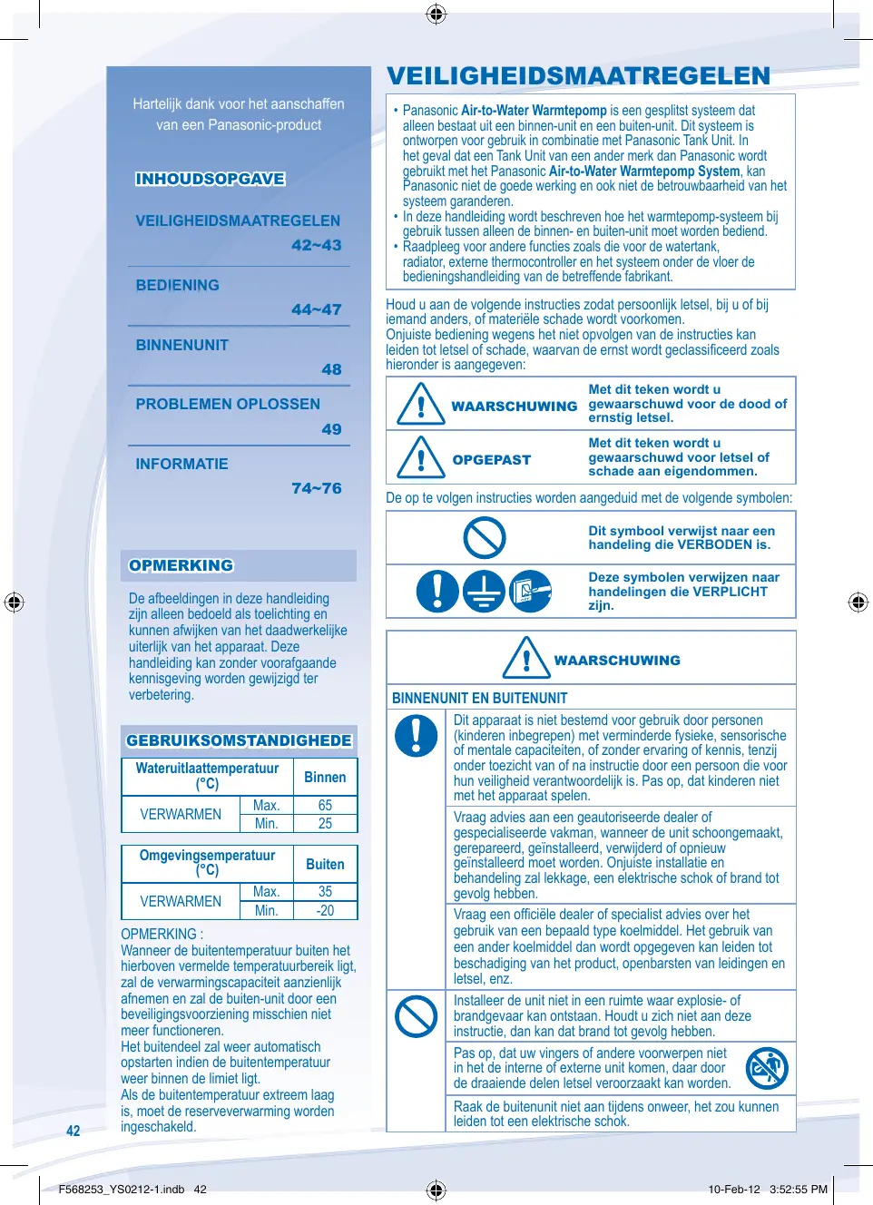 10-Feb-12 3:52:55 PM VEILIGHEIDSMAATREGELEN Hartelijk dank voor het aanschaffen van een Panasonic-product INHOUDSOPGAVE VEILIGHEIDSMAATREGELEN 42~43 BEDIENING 44~47 BINNENUNIT 48 PROBLEMEN OPLOSSEN 49