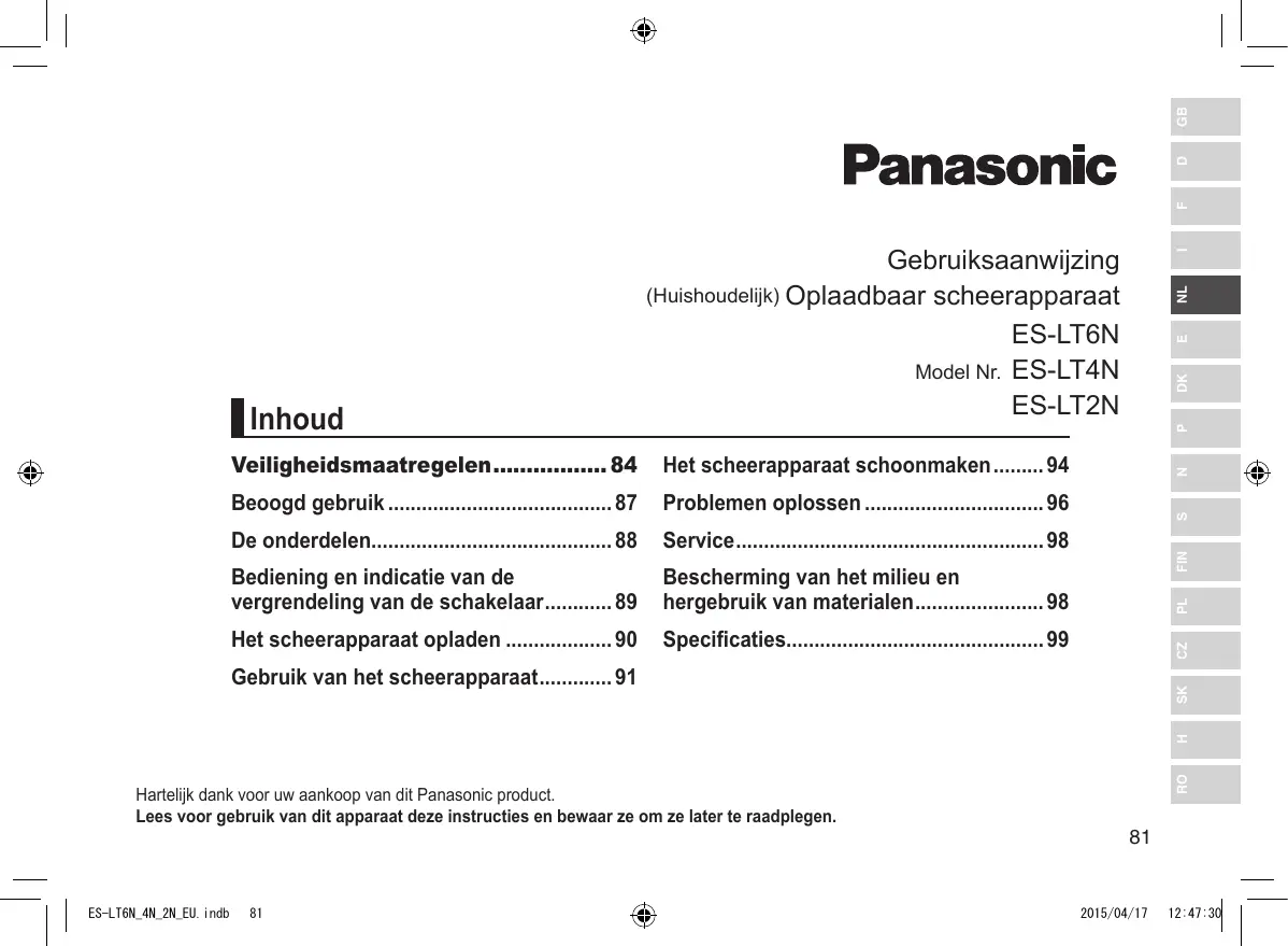 (Huishoudelijk) Oplaadbaar Hartelijk dank voor uw aankoop van dit Panasonic product. Lees voor gebruik van dit apparaat deze instructies en bewaar ze om ze later te raadplegen. ES-LT6N_4N_2N_EU.indb