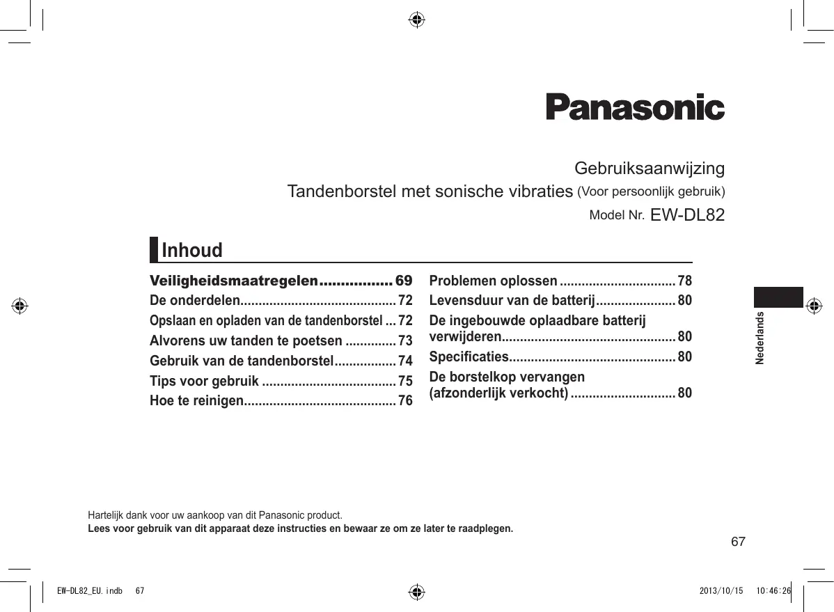 - 2013/10/15 10:46:26 Gebruiksaanwijzing Tandenborstel met sonische vibraties (Voor persoonlijk gebruik) Model Nr. EW‑DL82 Inhoud Problemen oplossen p. 78
