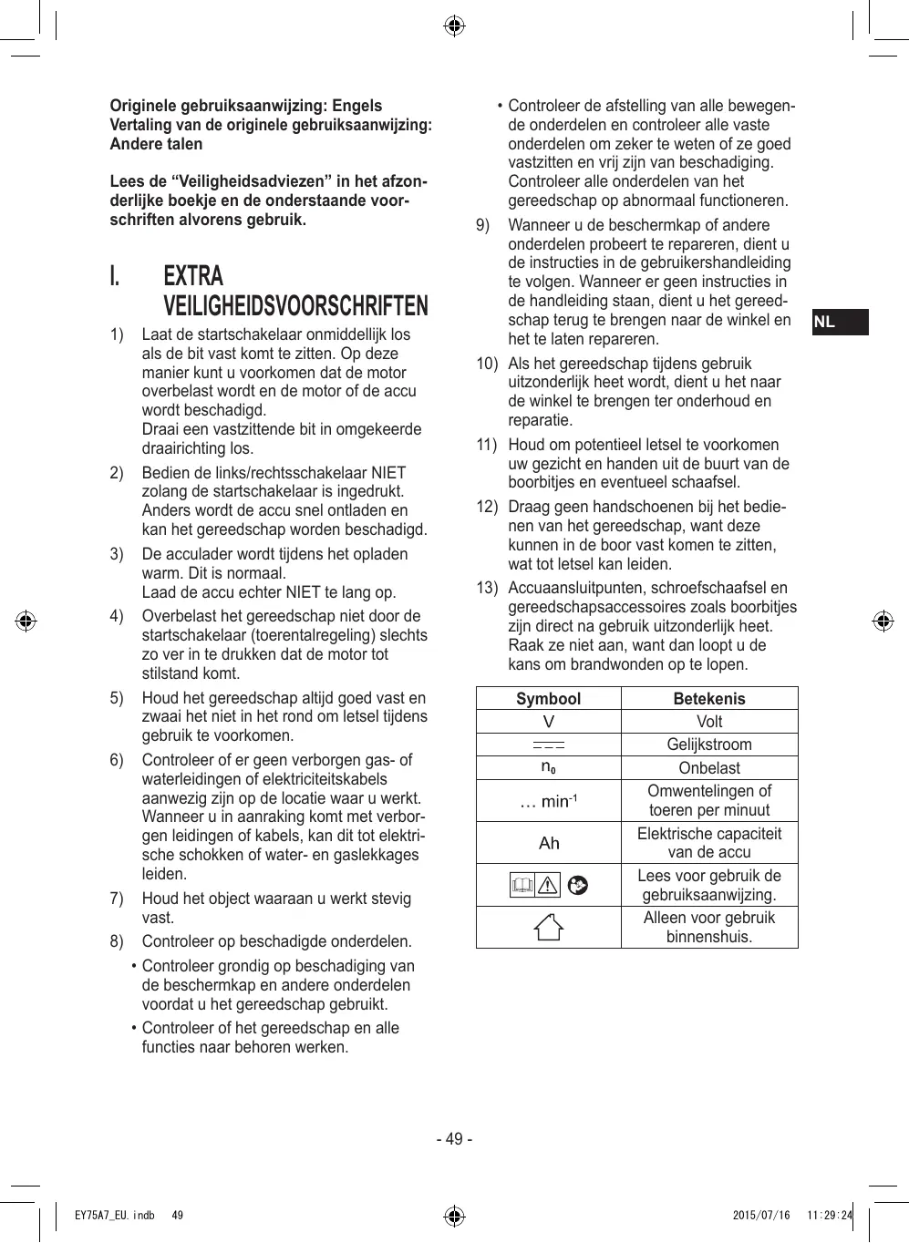 - • Ga niet als volgt om met oplaadbare gereedschappen. (Er bestaat een risico van rookvorming, brand en breuk) -- Gebruik of achterlaten op plaatsen waar het gereedschap aan regen of vocht wordt blootgesteld -- Gebruik terwijl het gereedschap is ondergedompeld in water EY75A7_EU.indb