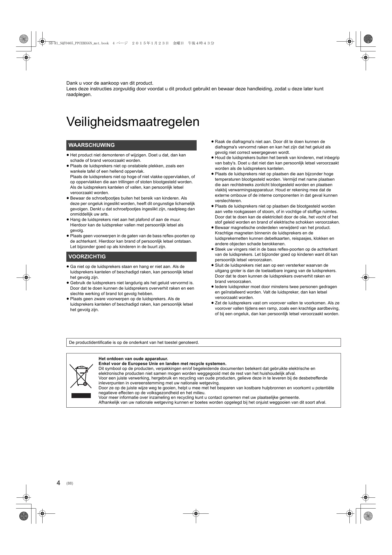 Dank u voor de aankoop van dit product. Lees deze instructies zorgvuldig door voordat u dit product gebruikt en bewaar deze handleiding, zodat u deze later kunt raadplegen. Veiligheidsmaatregelen WAARSCHUWING ≥ Het product niet demonteren of wijzigen. Doet u dat, dan kan schade of brand veroorzaakt worden. ≥ Plaats de luidsprekers niet op onstabiele plekken, zoals een wankele tafel of een hellend oppervlak. Plaats de luidsprekers niet op hoge of niet vlakke oppervlakken, of op oppervlakken die aan trillingen of stoten blootgesteld worden. Als de luidsprekers kantelen of vallen, kan persoonlijk letsel veroorzaakt worden. ≥ Bewaar de schroefpootjes buiten het bereik van kinderen. Als deze per ongeluk ingeslikt worden, heeft dit ongunstige lichamelijk gevolgen. Denkt u dat schroefpootjes ingeslikt zijn, raadpleeg dan onmiddellijk uw arts. ≥ Hang de luidsprekers niet aan het plafond of aan de muur. Hierdoor kan de luidspreker vallen met persoonlijk letsel als gevolg. ≥ Plaats geen voorwerpen in de gaten van de bass reflex-poorten op de achterkant. Hierdoor kan brand of persoonlijk letsel ontstaan. Let bijzonder goed op als kinderen in de buurt zijn. VOORZICHTIG ≥ Ga niet op de luidsprekers staan en hang er niet aan. Als de luidsprekers kantelen of beschadigd raken, kan persoonlijk letsel het gevolg zijn. ≥ Gebruik de luidsprekers niet langdurig als het geluid vervormd is. Door dat te doen kunnen de luidsprekers oververhit raken en een slechte werking of brand tot gevolg hebben. ≥ Plaats geen zware voorwerpen op de luidsprekers. Als de luidsprekers kantelen of beschadigd raken, kan persoonlijk letsel het gevolg zijn. ≥ Raak de diafragma's niet aan. Door dit te doen kunnen de diafragma's vervormd raken en kan het zijn dat het geluid als gevolg niet correct weergegeven wordt. ≥ Houd de luidsprekers buiten het bereik van kinderen, met inbegrip van baby's. Doet u dat niet dan kan persoonlijk letsel veroorzaakt worden als de luidsprekers kantelen. ≥ Plaats de luidsprekers niet op plaatsen die aan bijzonder hoge temperaturen blootgesteld worden. Vermijd met name plaatsen die aan rechtstreeks zonlicht blootgesteld worden en plaatsen vlakbij verwarmingsapparatuur. Houd er rekening mee dat de externe ombouw of de interne componenten in dat geval kunnen verslechteren. ≥ Plaats de luidsprekers niet op plaatsen die blootgesteld worden aan vette rookgassen of stoom, of in vochtige of stoffige ruimtes. Door dat te doen kan de elektriciteit door de olie, het vocht of het stof geleid worden en brand of elektrische schokken veroorzaken. ≥ Bewaar magnetische onderdelen verwijderd van het product. Krachtige magneten binnenin de luidsprekers en de luidsprekernetten kunnen debetkaarten, reispasjes, klokken en andere objecten schade berokkenen. ≥ Steek uw vingers niet in de bass reflex-poorten op de achterkant van de luidsprekers. Let bijzonder goed op kinderen want dit kan persoonlijk letsel veroorzaken. ≥ Sluit de luidsprekers niet aan op een versterker waarvan de uitgang groter is dan de toelaatbare ingang van de luidsprekers. Door dat te doen kunnen de luidsprekers oververhit raken en brand veroorzaken. ≥ Iedere luidspreker moet door minstens twee personen gedragen en geïnstalleerd worden. Valt de luidspreker, dan kan letsel veroorzaakt worden. ≥ Zet de luidsprekers vast om voorover vallen te voorkomen. Als ze voorover vallen tijdens een ramp, zoals een krachtige aardbeving, of bij een ongeluk, dan kan persoonlijk letsel veroorzaakt worden. De productidentificatie is op de onderkant van het toestel genoteerd. Het ontdoen van oude apparatuur. Enkel voor de Europese Unie en landen met recycle systemen. Dit symbool op de producten, verpakkingen en/of begeleidende documenten betekent dat gebruikte elektrische en elektronische producten niet samen mogen worden weggegooid met de rest van het huishoudelijk afval. Voor een juiste verwerking, hergebruik en recycling van oude producten, gelieve deze in te leveren bij de desbetreffende inleverpunten in overeenstemming met uw nationale wetgeving. Door ze op de juiste wijze weg te gooien, helpt u mee met het besparen van kostbare hulpbronnen en voorkomt u potentiële negatieve effecten op de volksgezondheid en het milieu. Voor meer informatie over inzameling en recycling kunt u contact opnemen met uw plaatselijke gemeente. Afhankelijk van uw nationale wetgeving kunnen er boetes worden opgelegd bij het onjuist weggooien van dit soort afval.