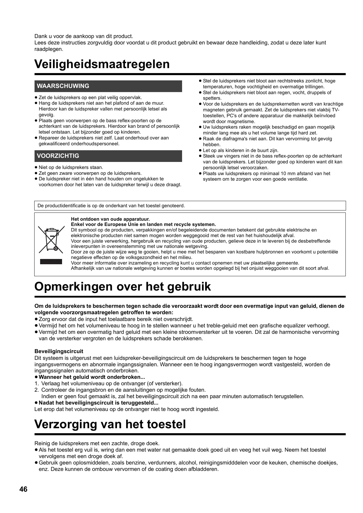 Dank u voor de aankoop van dit product. Lees deze instructies zorgvuldig door voordat u dit product gebruikt en bewaar deze handleiding, zodat u deze later kunt raadplegen. Veiligheidsmaatregelen WAARSCHUWING ≥ Zet de luidsprekers op een plat veilig oppervlak. ≥ Hang de luidsprekers niet aan het plafond of aan de muur. Hierdoor kan de luidspreker vallen met persoonlijk letsel als gevolg. ≥ Plaats geen voorwerpen op de bass reflex-poorten op de achterkant van de luidsprekers. Hierdoor kan brand of persoonlijk letsel ontstaan. Let bijzonder goed op kinderen. ≥ Repareer de luidsprekers niet zelf. Laat onderhoud over aan gekwalificeerd onderhoudspersoneel. VOORZICHTIG ≥ Niet op de luidsprekers staan. ≥ Zet geen zware voorwerpen op de luidsprekers. ≥ De luidspreker niet in één hand houden om ongelukken te voorkomen door het laten van de luidspreker terwijl u deze draagt. ≥ Stel de luidsprekers niet bloot aan rechtstreeks zonlicht, hoge temperaturen, hoge vochtigheid en overmatige trillingen. ≥ Stel de luidsprekers niet bloot aan regen, vocht, druppels of spetters. ≥ Voor de luidsprekers en de luidsprekernetten wordt van krachtige magneten gebruik gemaakt. Zet de luidsprekers niet vlakbij TVtoestellen, PC's of andere apparatuur die makkelijk beïnvloed wordt door magnetisme. ≥ Uw luidsprekers raken mogelijk beschadigd en gaan mogelijk minder lang mee als u het volume lange tijd hard zet. ≥ Raak de diafragma's niet aan. Dit kan vervorming tot gevolg hebben. ≥ Let op als kinderen in de buurt zijn. ≥ Steek uw vingers niet in de bass reflex-poorten op de achterkant van de luidsprekers. Let bijzonder goed op kinderen want dit kan persoonlijk letsel veroorzaken. ≥ Plaats uw luidsprekers op minimaal 10 mm afstand van het systeem om te zorgen voor een goede ventilatie. De productidentificatie is op de onderkant van het toestel genoteerd. Het ontdoen van oude apparatuur. Enkel voor de Europese Unie en landen met recycle systemen. Dit symbool op de producten, verpakkingen en/of begeleidende documenten betekent dat gebruikte elektrische en elektronische producten niet samen mogen worden weggegooid met de rest van het huishoudelijk afval. Voor een juiste verwerking, hergebruik en recycling van oude producten, gelieve deze in te leveren bij de desbetreffende inleverpunten in overeenstemming met uw nationale wetgeving. Door ze op de juiste wijze weg te gooien, helpt u mee met het besparen van kostbare hulpbronnen en voorkomt u potentiële negatieve effecten op de volksgezondheid en het milieu. Voor meer informatie over inzameling en recycling kunt u contact opnemen met uw plaatselijke gemeente. Afhankelijk van uw nationale wetgeving kunnen er boetes worden opgelegd bij het onjuist weggooien van dit soort afval. Opmerkingen over het gebruik Om de luidsprekers te beschermen tegen schade die veroorzaakt wordt door een overmatige input van geluid, dienen de volgende voorzorgsmaatregelen getroffen te worden: ≥ Zorg ervoor dat de input het toelaatbare bereik niet overschrijdt. ≥ Vermijd het om het volumeniveau te hoog in te stellen wanneer u het treble-geluid met een grafische equalizer verhoogt. ≥ Vermijd het om een overmatig hard geluid met een kleine stroomversterker uit te voeren. Dit zal de harmonische vervorming van de versterker vergroten en de luidsprekers schade berokkenen. Beveiligingscircuit Dit systeem is uitgerust met een luidspreker-beveiligingscircuit om de luidsprekers te beschermen tegen te hoge ingangsvermogens en abnormale ingangssignalen. Wanneer een te hoog ingangsvermogen wordt vastgesteld, worden de ingangssignalen automatisch onderbroken. ≥ Wanneer het geluid wordt onderbroken...