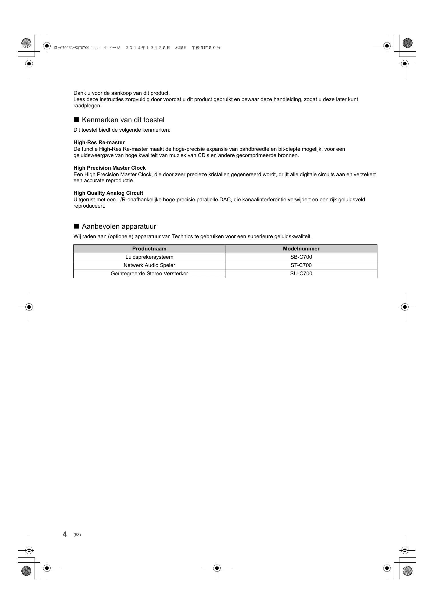 Dank u voor de aankoop van dit product. Lees deze instructies zorgvuldig door voordat u dit product gebruikt en bewaar deze handleiding, zodat u deze later kunt raadplegen. ∫ Kenmerken van dit toestel Dit toestel biedt de volgende kenmerken: High-Res Re-master De functie High-Res Re-master maakt de hoge-precisie expansie van bandbreedte en bit-diepte mogelijk, voor een geluidsweergave van hoge kwaliteit van muziek van CD's en andere gecomprimeerde bronnen. High Precision Master Clock Een High Precision Master Clock, die door zeer precieze kristallen gegenereerd wordt, drijft alle digitale circuits aan en verzekert een accurate reproductie. High Quality Analog Circuit Uitgerust met een L/R-onafhankelijke hoge-precisie parallelle DAC, die kanaalinterferentie verwijdert en een rijk geluidsveld reproduceert. ∫ Aanbevolen apparatuur Wij raden aan (optionele) apparatuur van Technics te gebruiken voor een superieure geluidskwaliteit.