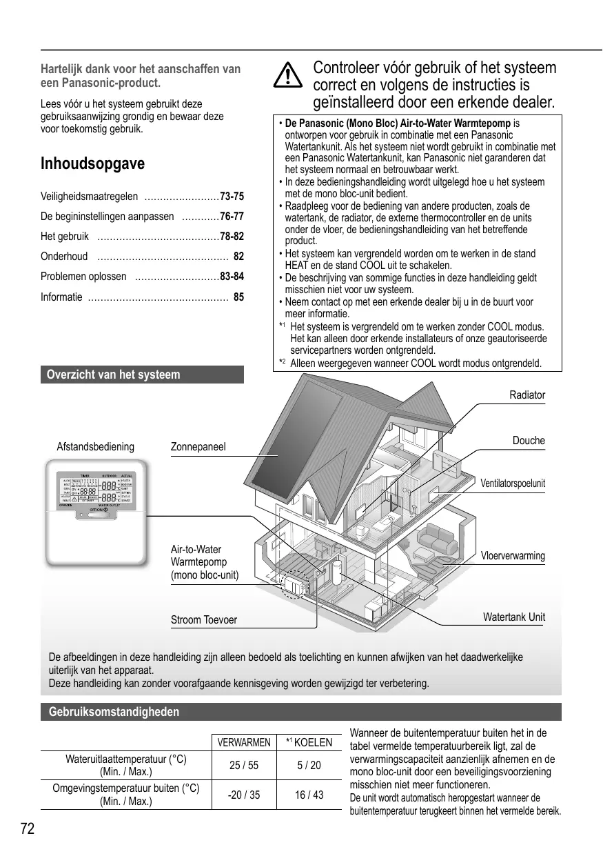 Controleer vóór gebruik of het systeem correct en volgens de instructies is geïnstalleerd door een erkende dealer. • De Panasonic (Mono Bloc) Air-to-Water Warmtepomp is ontworpen voor gebruik in combinatie met een Panasonic Watertankunit. Als het systeem niet wordt gebruikt in combinatie met een Panasonic Watertankunit, kan Panasonic niet garanderen dat het systeem normaal en betrouwbaar werkt. • In deze bedieningshandleiding wordt uitgelegd hoe u het systeem met de mono bloc-unit bedient. • Raadpleeg voor de bediening van andere producten, zoals de watertank, de radiator, de externe thermocontroller en de units onder de vloer, de bedieningshandleiding van het betreffende product. • Het systeem kan vergrendeld worden om te werken in de stand HEAT en de stand COOL uit te schakelen. • De beschrijving van sommige functies in deze handleiding geldt misschien niet voor uw systeem. • Neem contact op met een erkende dealer bij u in de buurt voor meer informatie. *1 Het systeem is vergrendeld om te werken zonder COOL modus. Het kan alleen door erkende installateurs of onze geautoriseerde servicepartners worden ontgrendeld. *2 Alleen weergegeven wanneer COOL wordt modus ontgrendeld. Radiator