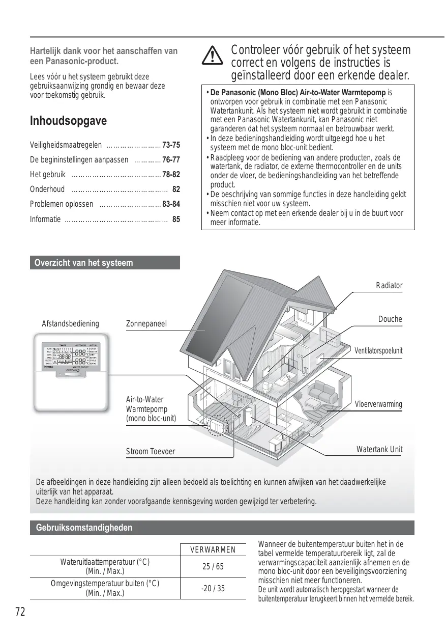 - Neem contact op met een erkende dealer bij u in de buurt voor meer informatie. Overzicht van het systeem Radiator Afstandsbediening Douche Zonnepaneel Ventilatorspoelunit Air-to-Water Warmtepomp (mono bloc-unit) Vloerverwarming Watertank Unit Stroom Toevoer De afbeeldingen in deze handleiding zijn alleen bedoeld als toelichting en kunnen afwijken van het daadwerkelijke uiterlijk van het apparaat. Deze handleiding kan zonder voorafgaande kennisgeving worden gewijzigd ter verbetering. Gebruiksomstandigheden VERWARMEN Wateruitlaattemperatuur (°C) (Min. / Max.) Omgevingstemperatuur buiten (°C) (Min. / Max.)